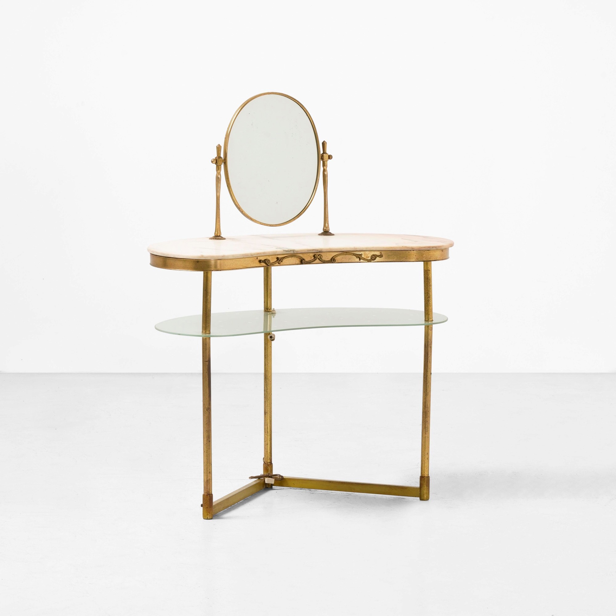 Struttura in ottone, piani in marmo e cristallo satinato.