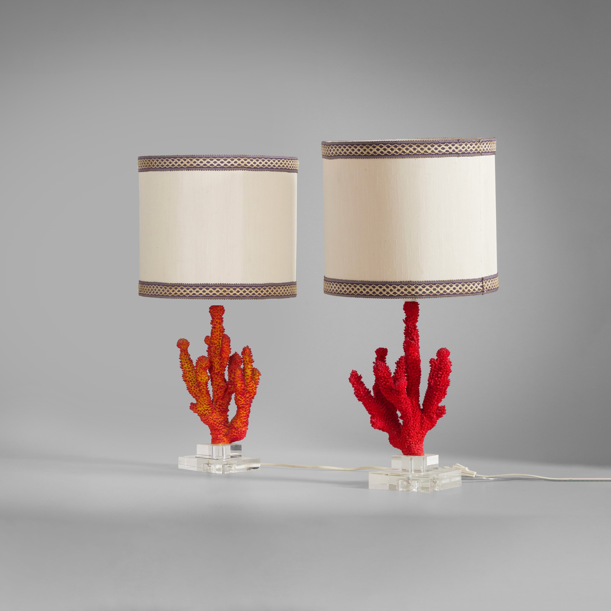 Struttura in resina con base in plexiglas. Paralume in tessuto.