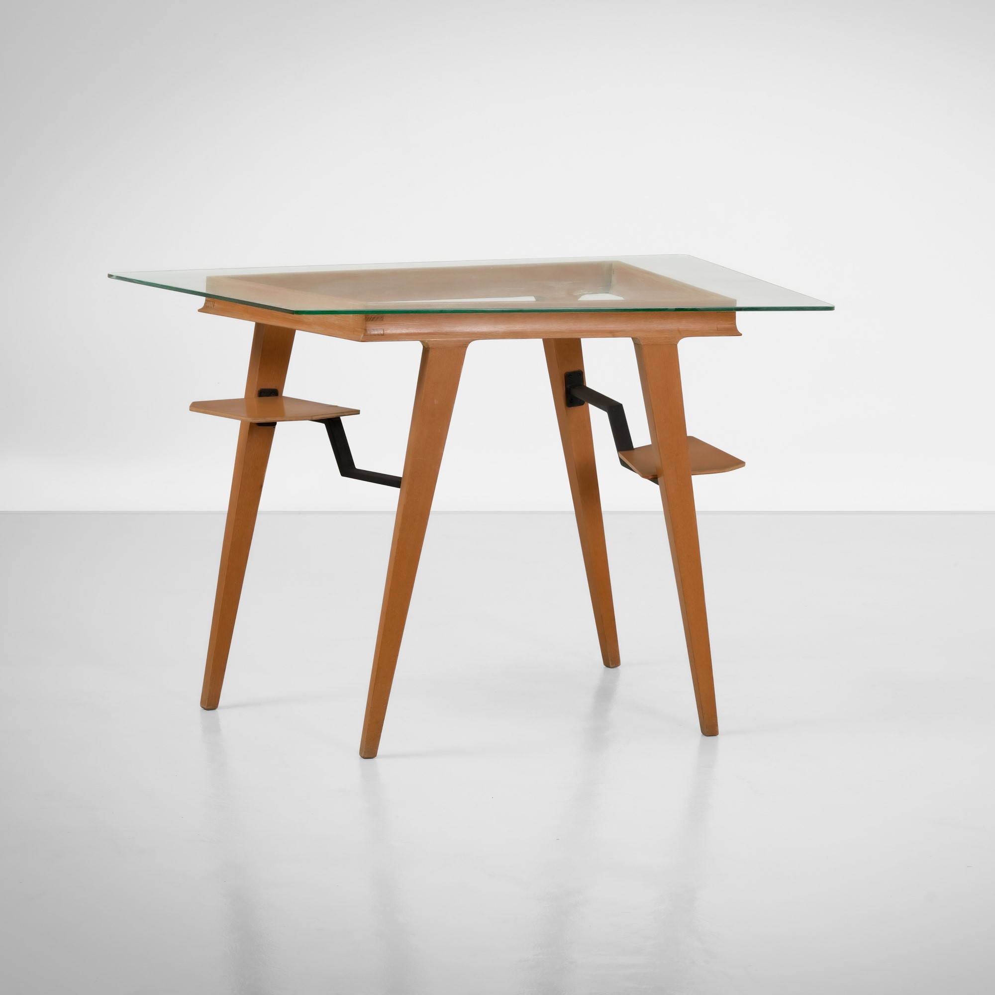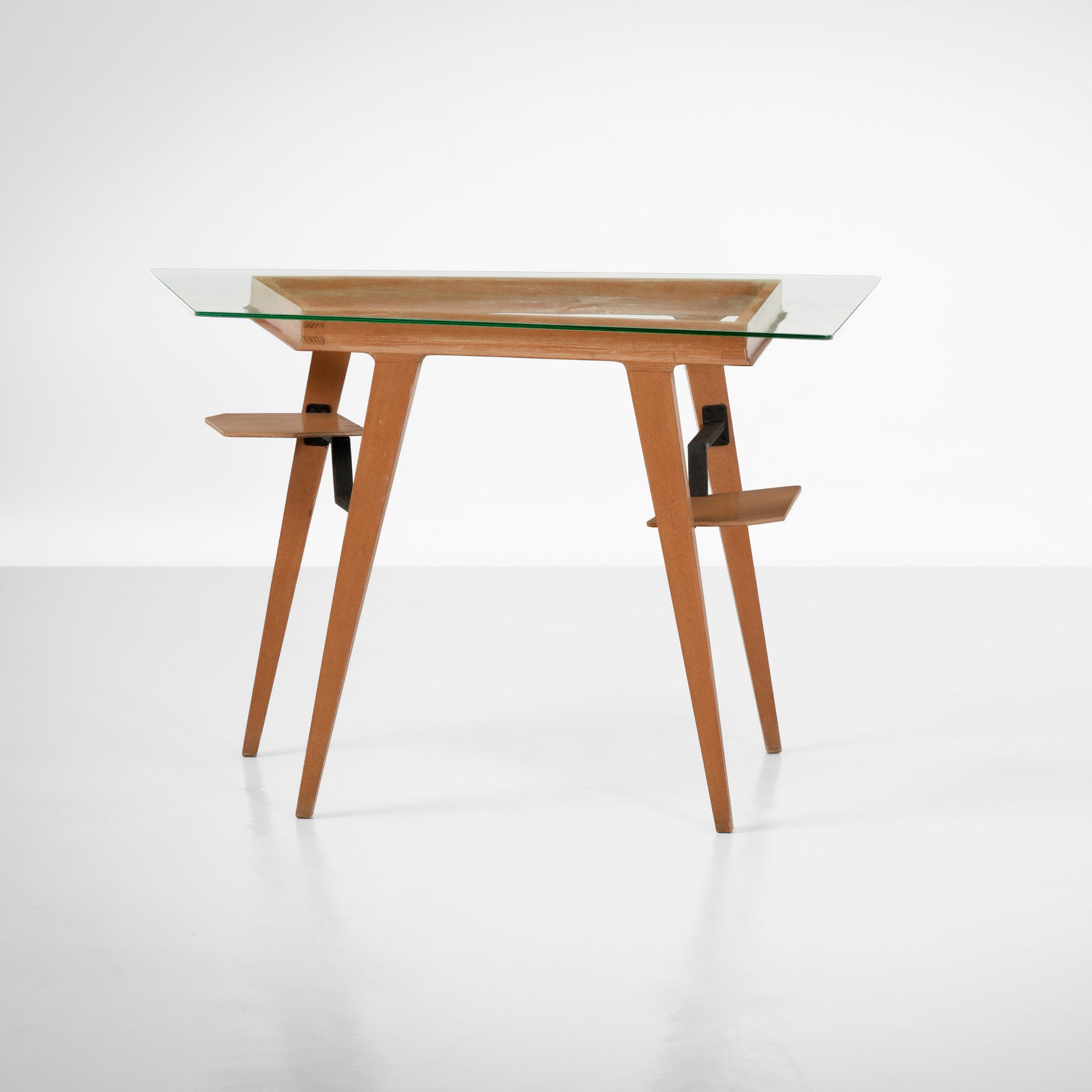 Struttura in legno, dettagli in metallo e piano in cristallo molato.