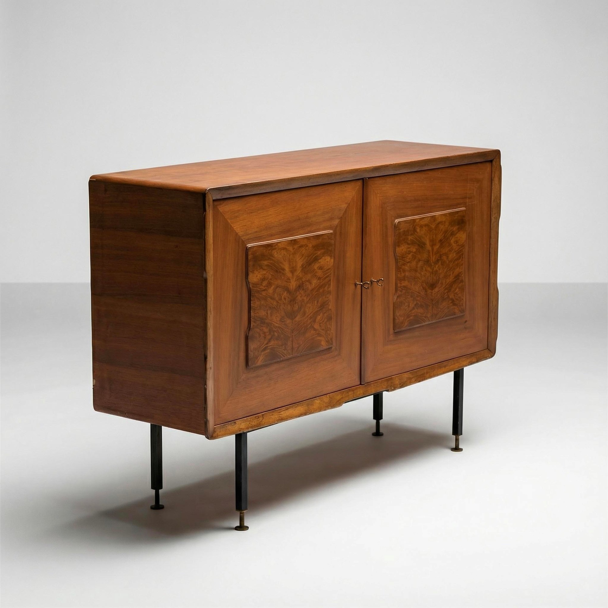 Struttura in legno e impiallacciatura di radica. Sostegni in metallo laccato.