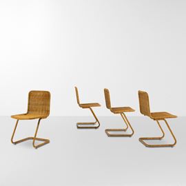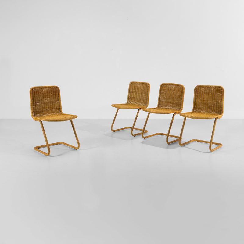 Struttura in metallo tubolare con rivestimenti e seduta in vimini.