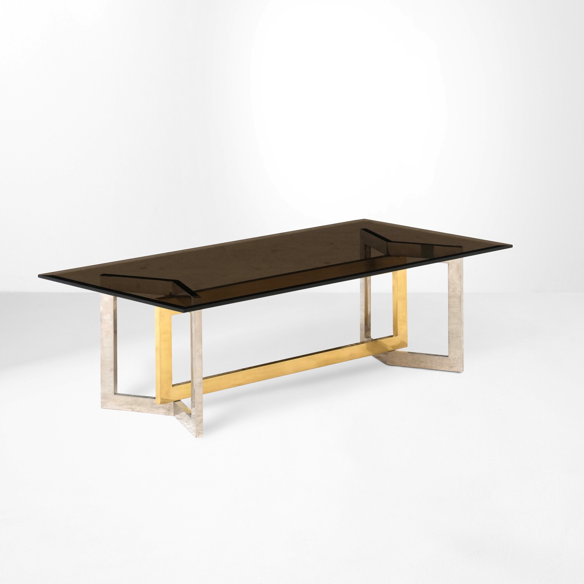 Struttura e sostegni in acciaio e ottone con piano in vetro colorato.