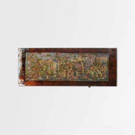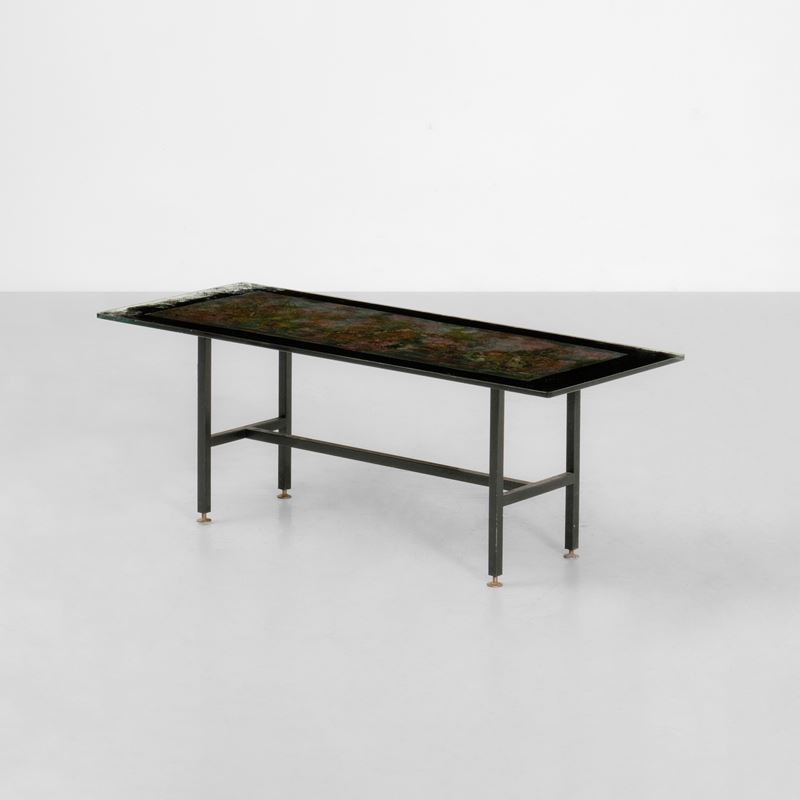 Struttura e sostegni in metallo, puntali in ottone. Piano in vetro decorato.