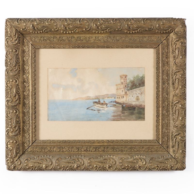 Acquerello su carta, in cornice Personaggi su barca a remi