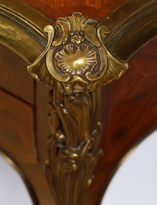 A sei luci, bracci a volute, fusto scanalato, tripode con base rocaille e piedi ferini