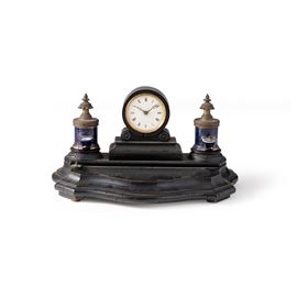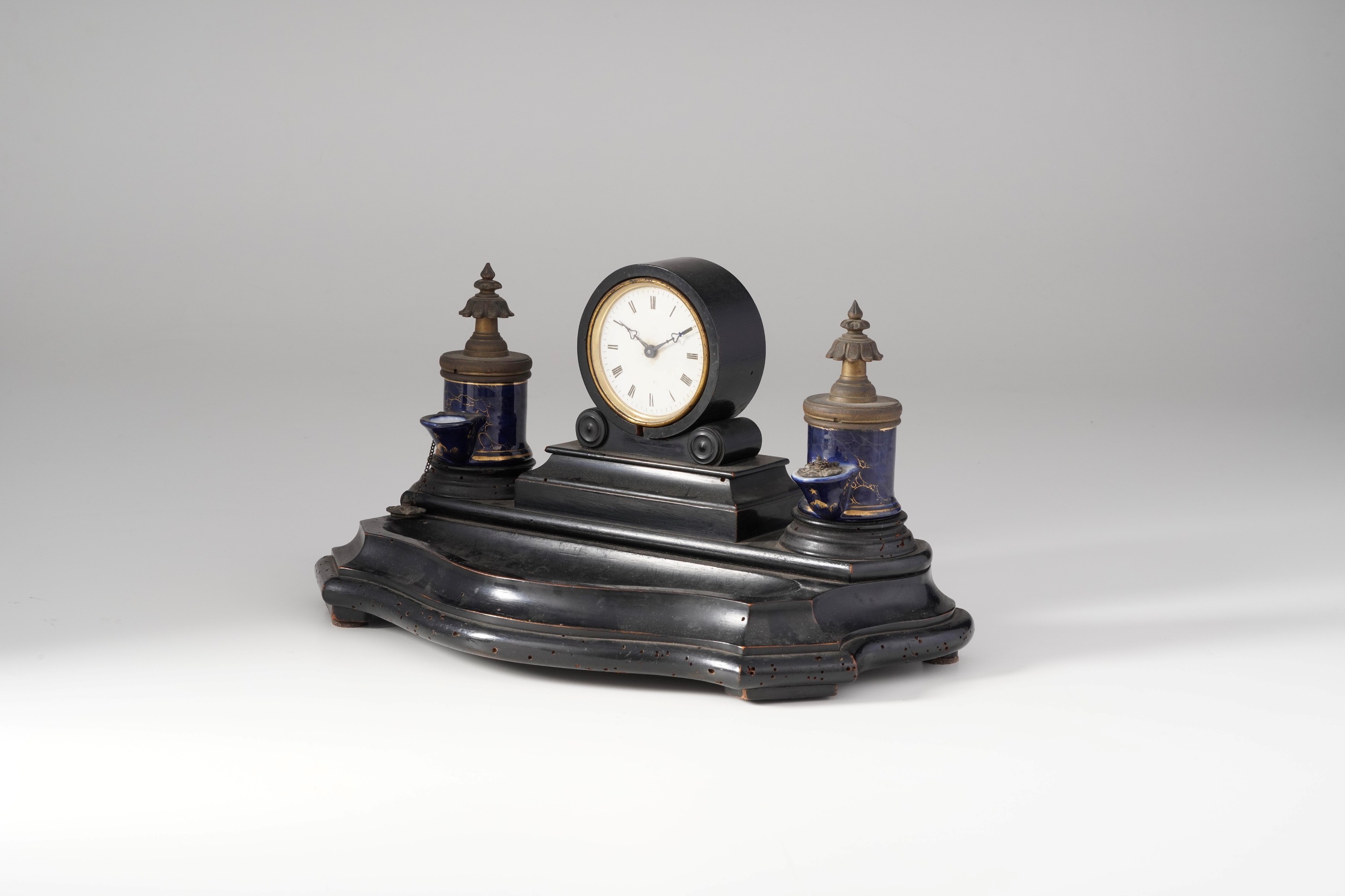Calamaio con orologio in legno ebanizzato. XIX-XX secolo