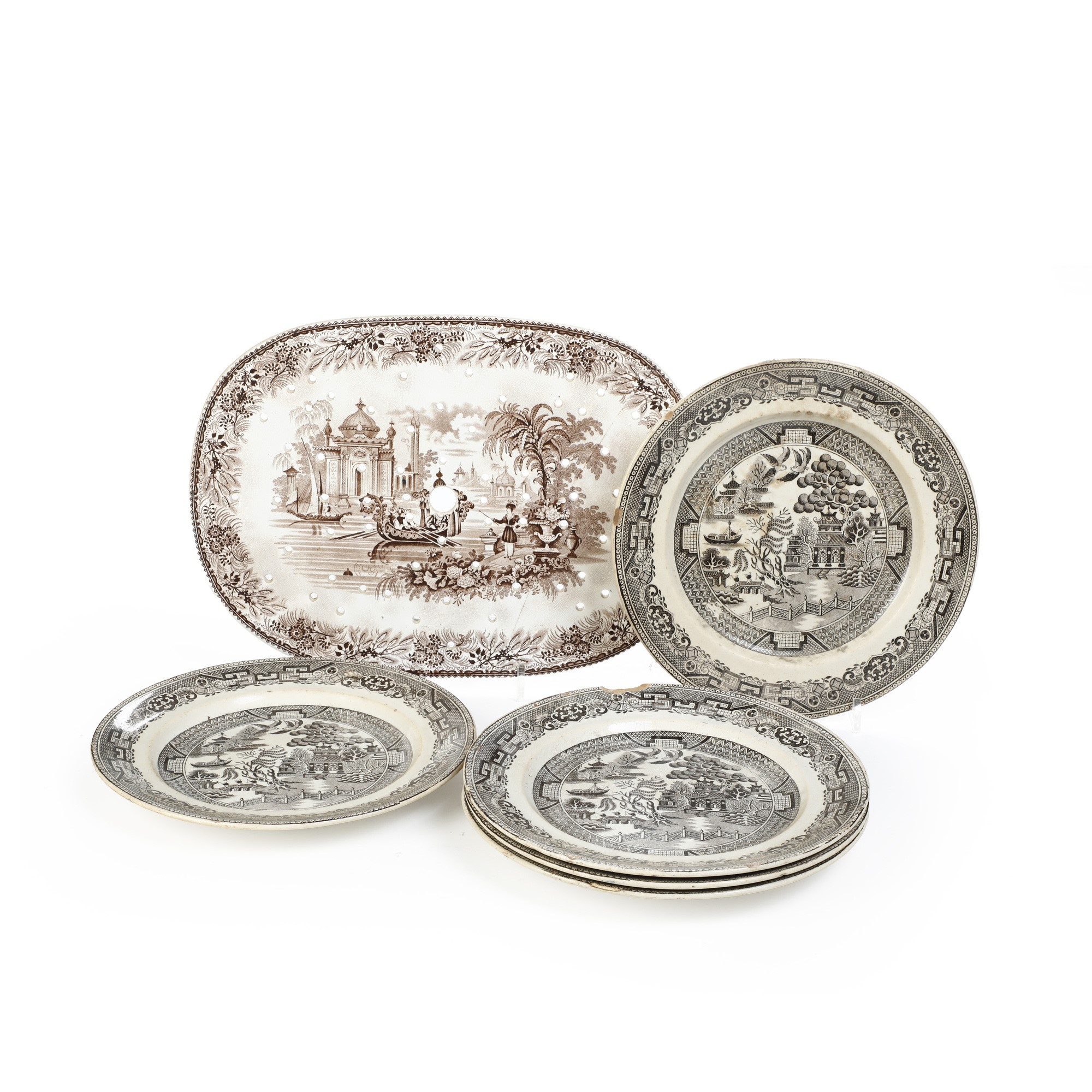 Al lotto si aggiunge un vassoio traforato, probabilmente inglese (cm 35x25; rotto in due frammenti e ricomposto).