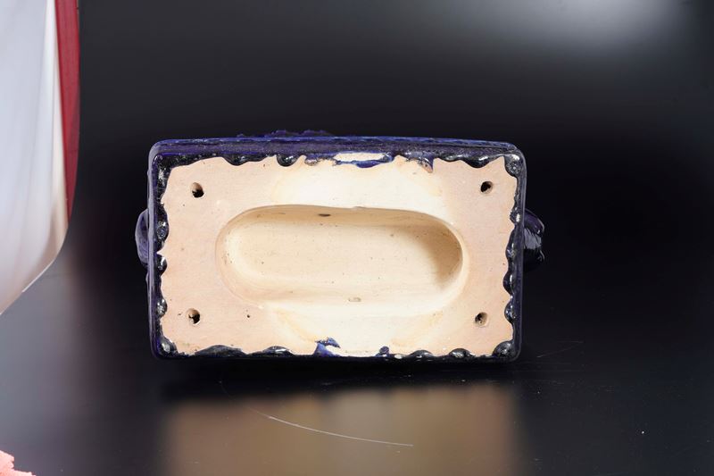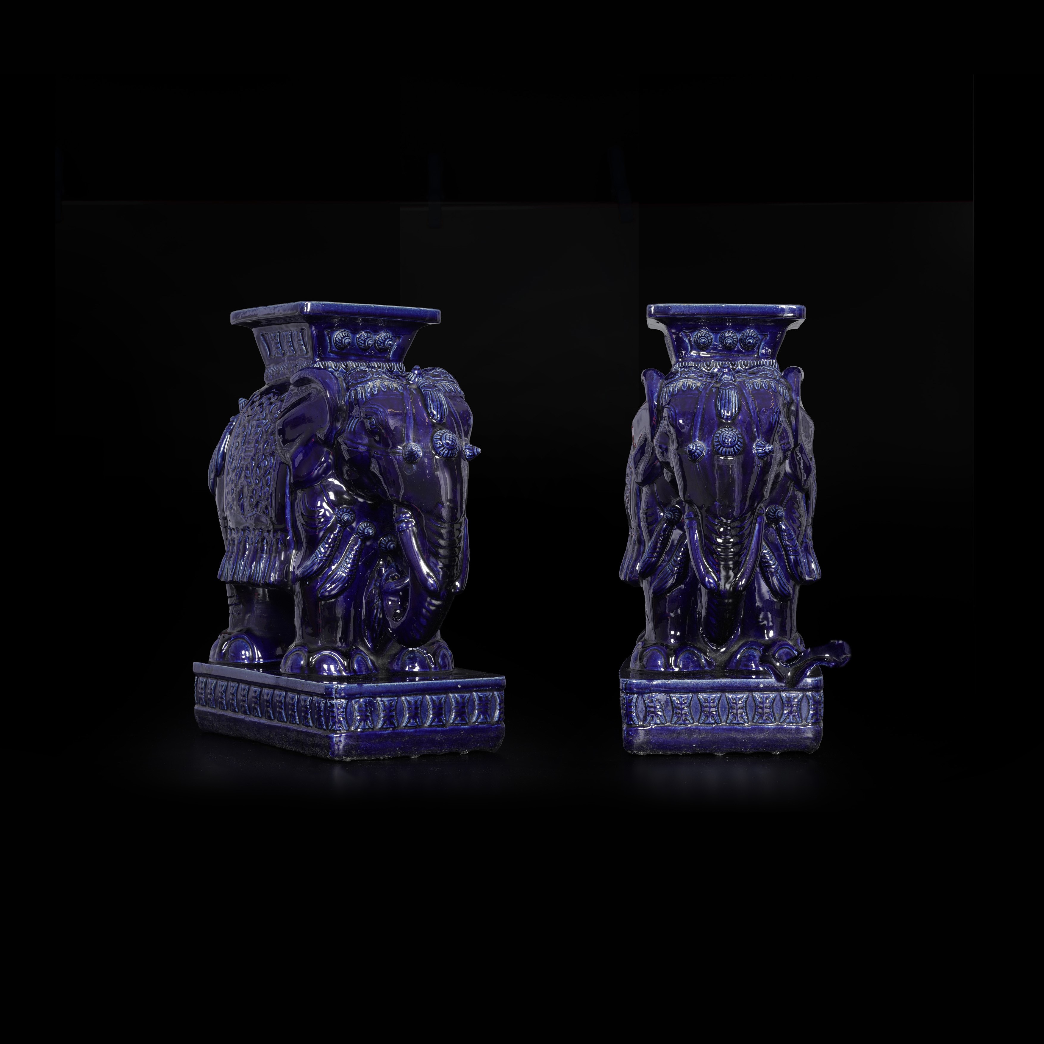 Coppia di piedistalli in ceramica invetriata a foggia di elefante