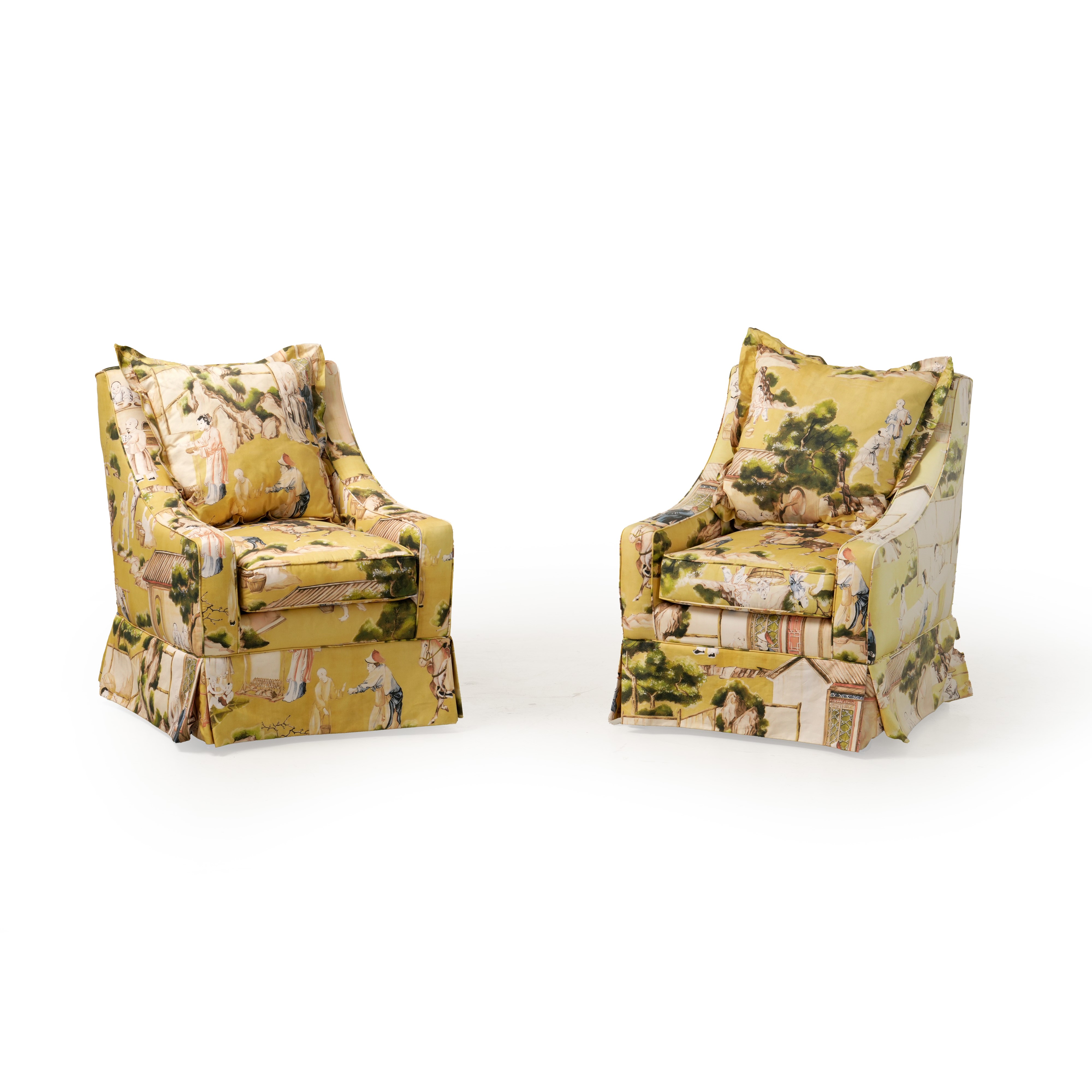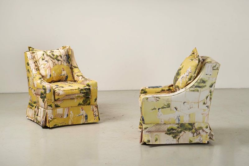 Coppia di poltrone imbottite con tappezzeria a cineserie