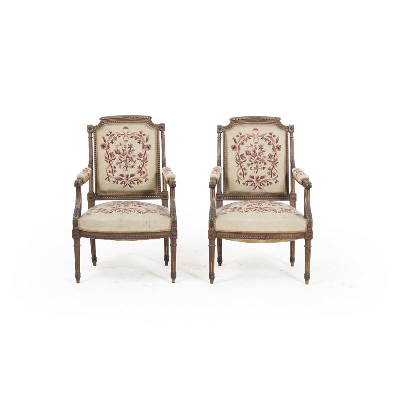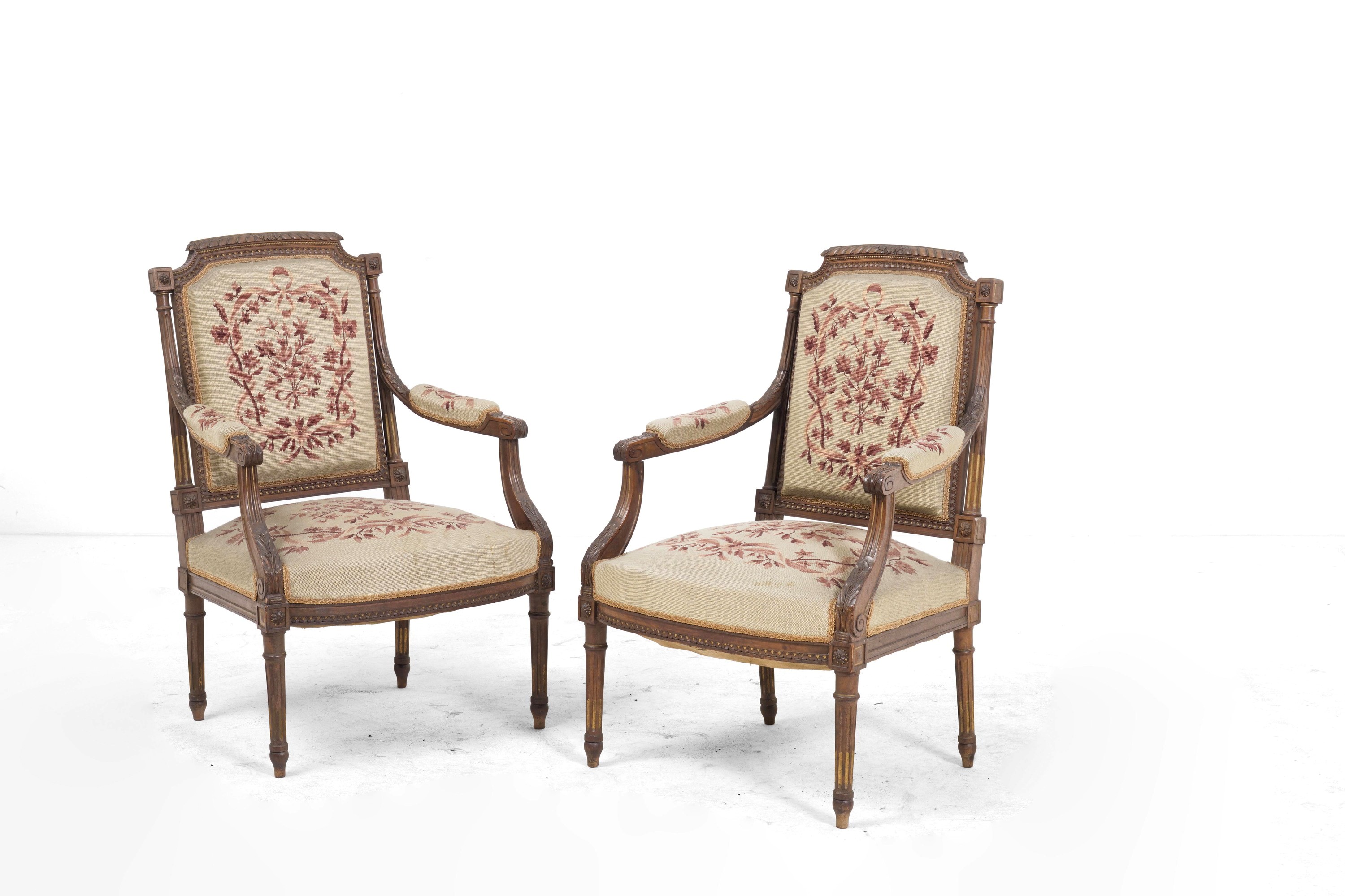 Coppia di poltrone imbottite e rivestite a piccolo punto. XIX secolo