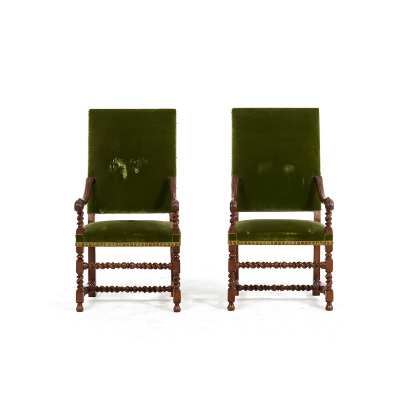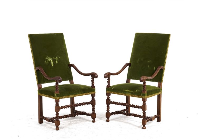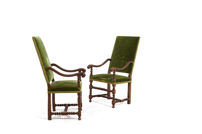 Gambe e traverse torchon, braccioli a volute, sedute e schienali imbottiti