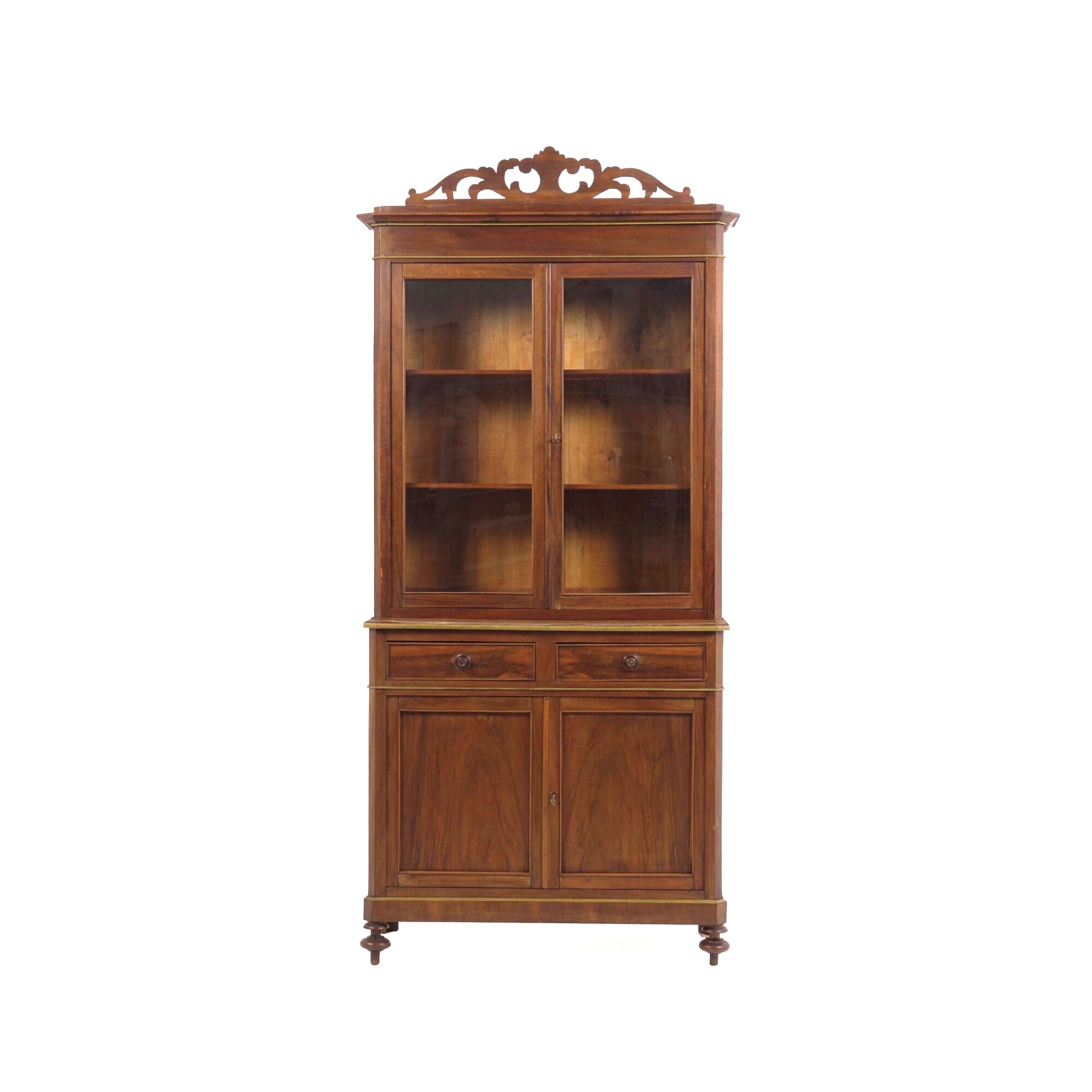 Fronte a due ante e due cassetti affiancati, alzata con ante a vetri, cimasa traforata con motivi vegetali