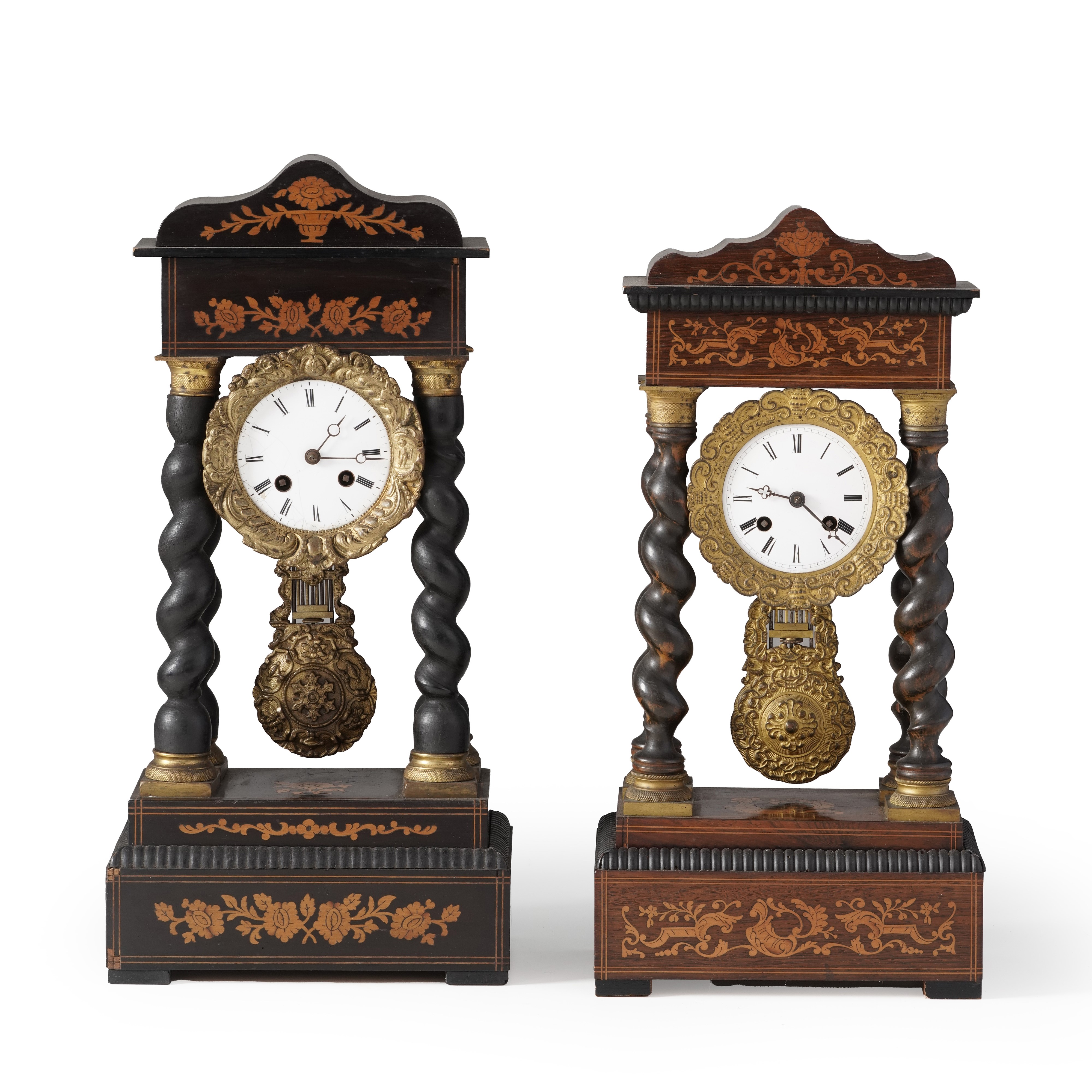 Base e cappello intarsiati, montanti torchon ebanizzati, quadrante in smalto bianco con numeri romani e bordo in metallo dorato