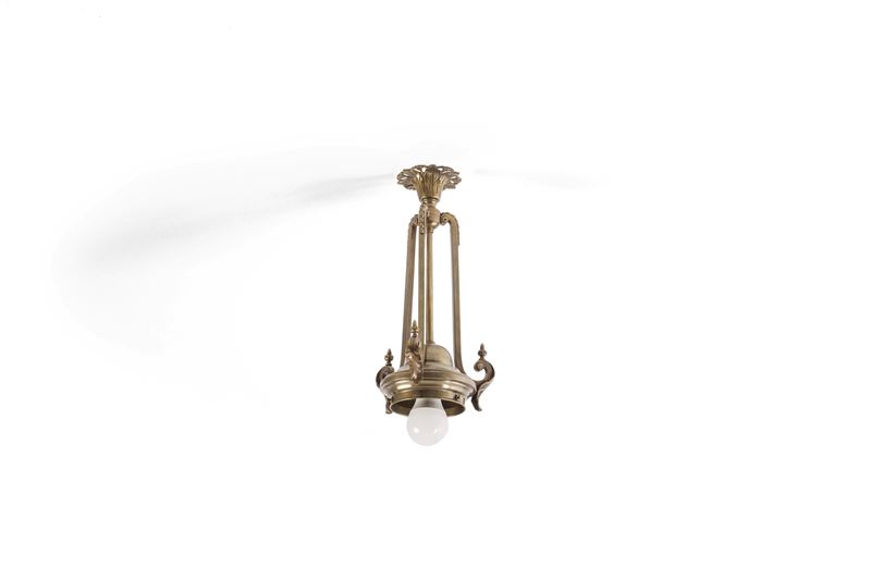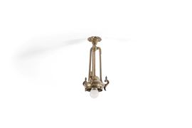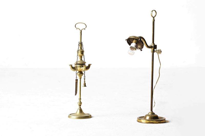 Lotto composta da una lampada, un portacandele e un piccolo lampadario in metallo dorato.
