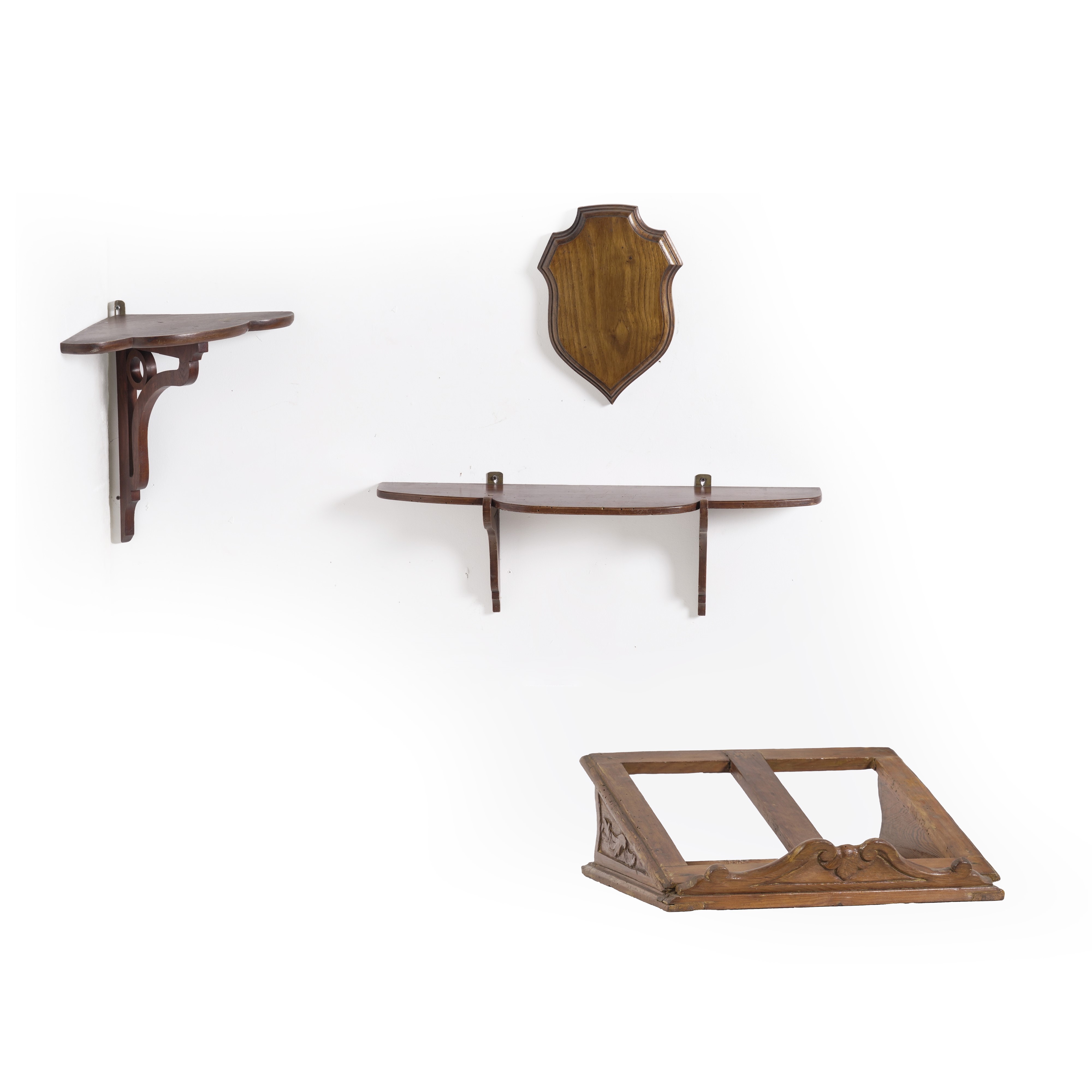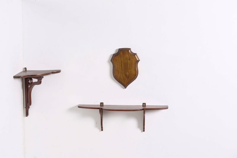 Lotto composto da una mensola, una mensolina angolare, un piccolo leggio e una placca in legno