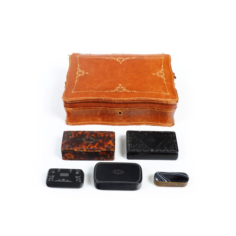 Lotto di cinque tabacchiere papier maché