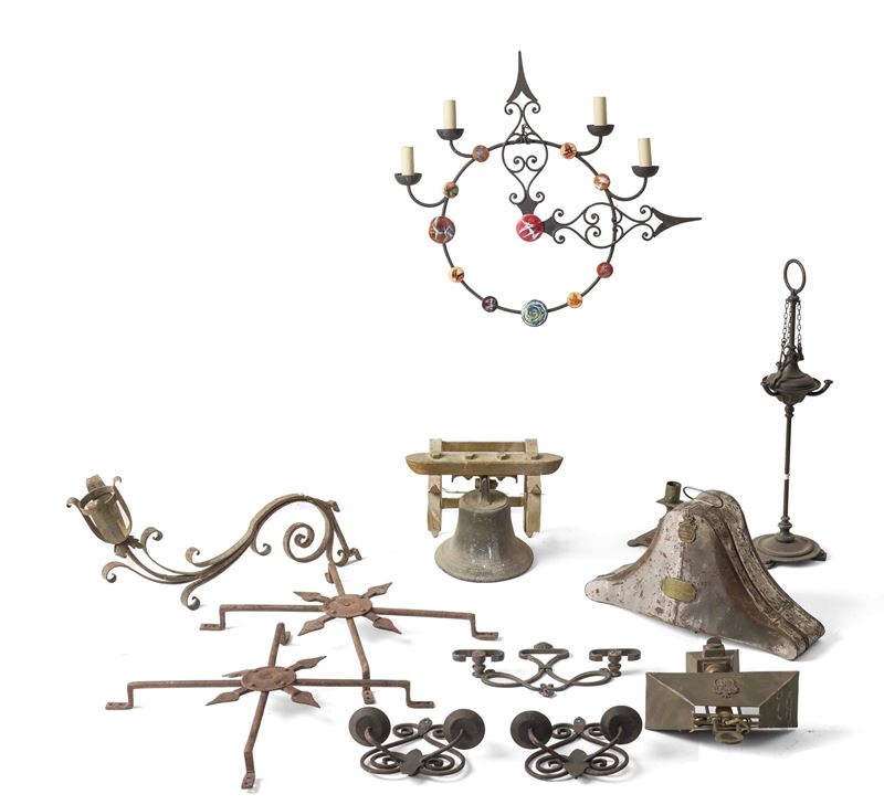 Lotto di oggetti in metallo tra cui lampade ed altro