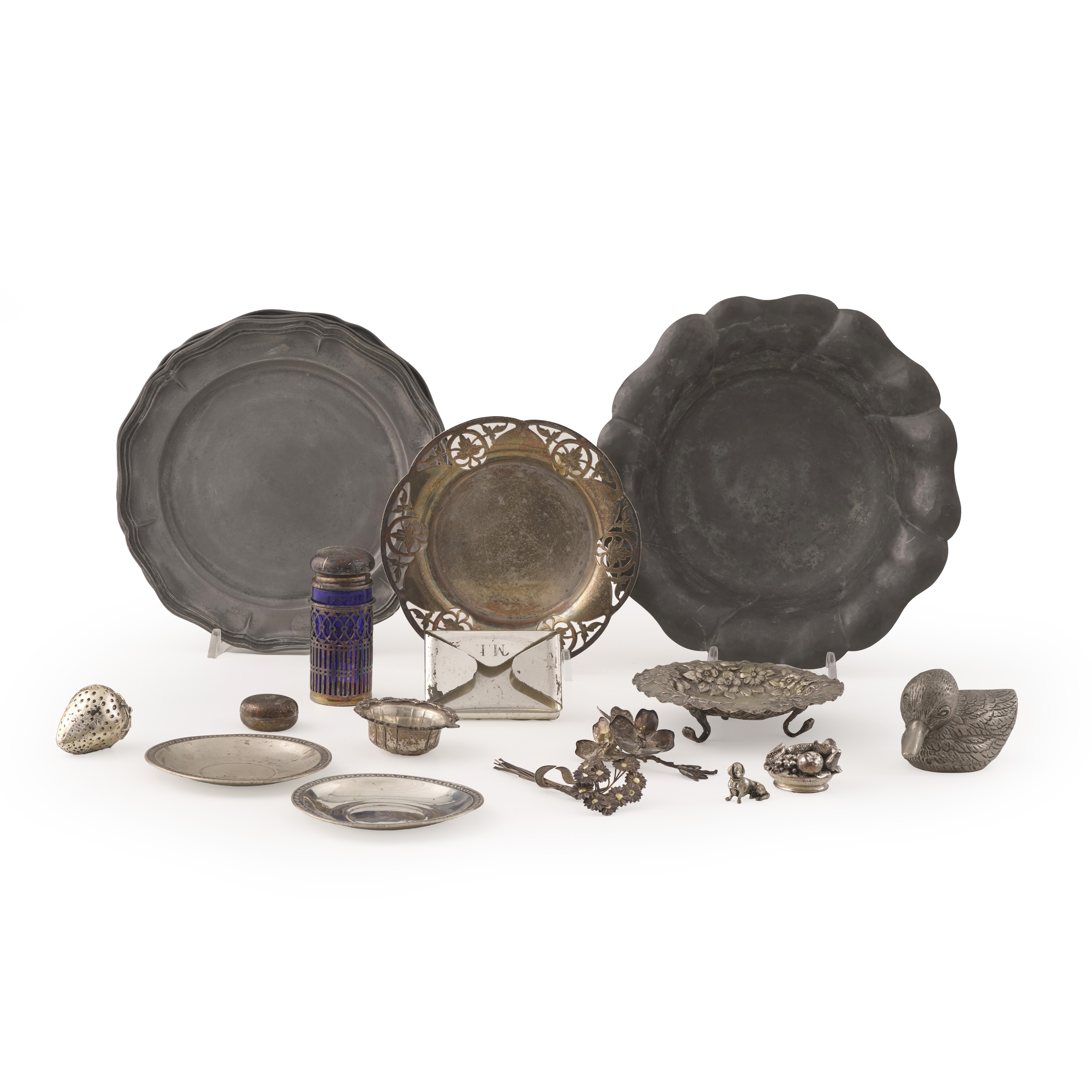 Lotto misto di curiosita in metallo argentato, argento e peltro