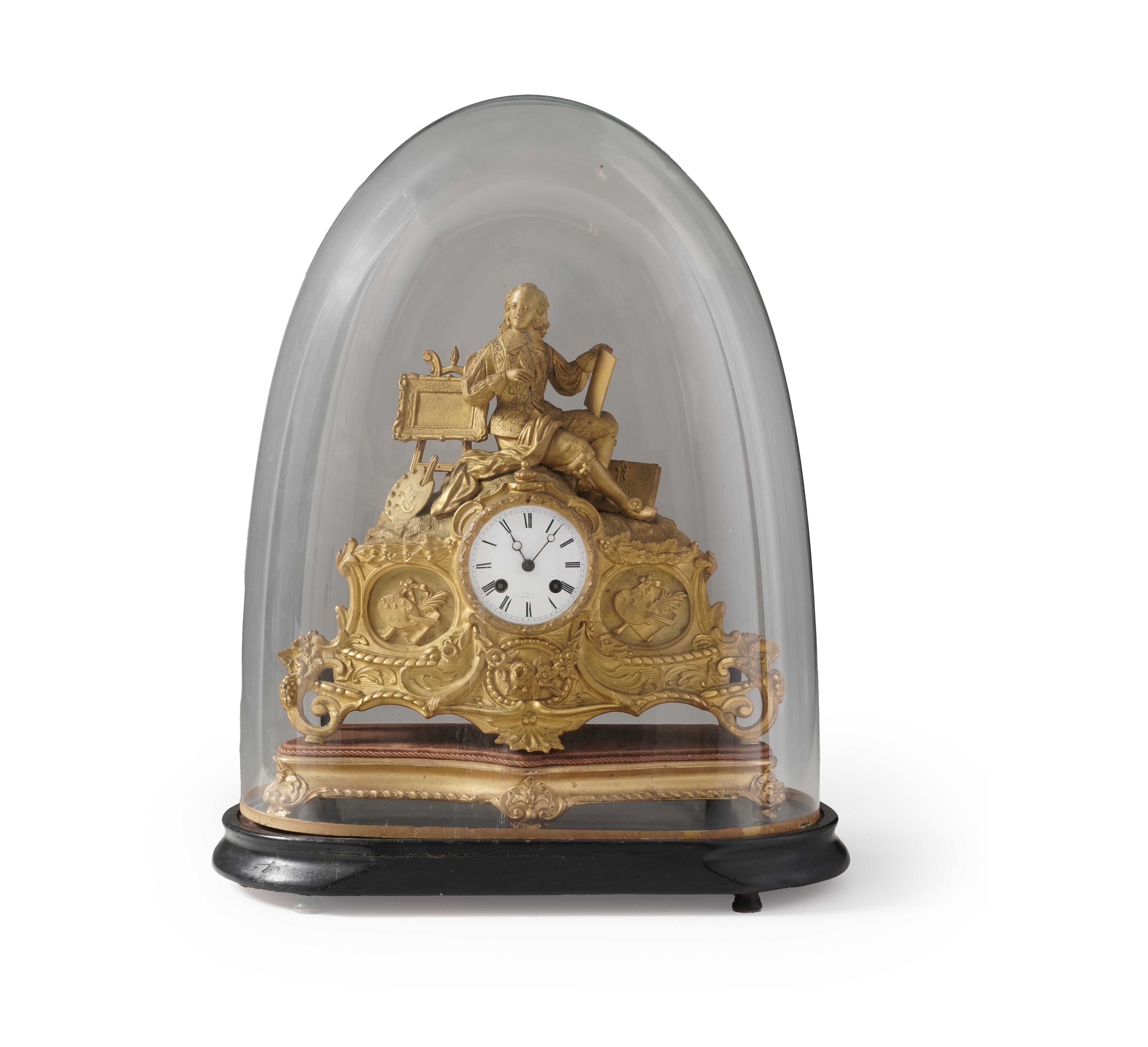 Cassa con decori rocaille a festoni e panoplie, cimasa a foggia di pittore in abiti settecenteschi, quadrante in smalto bianco con numeri romani. Entro campana di vetro