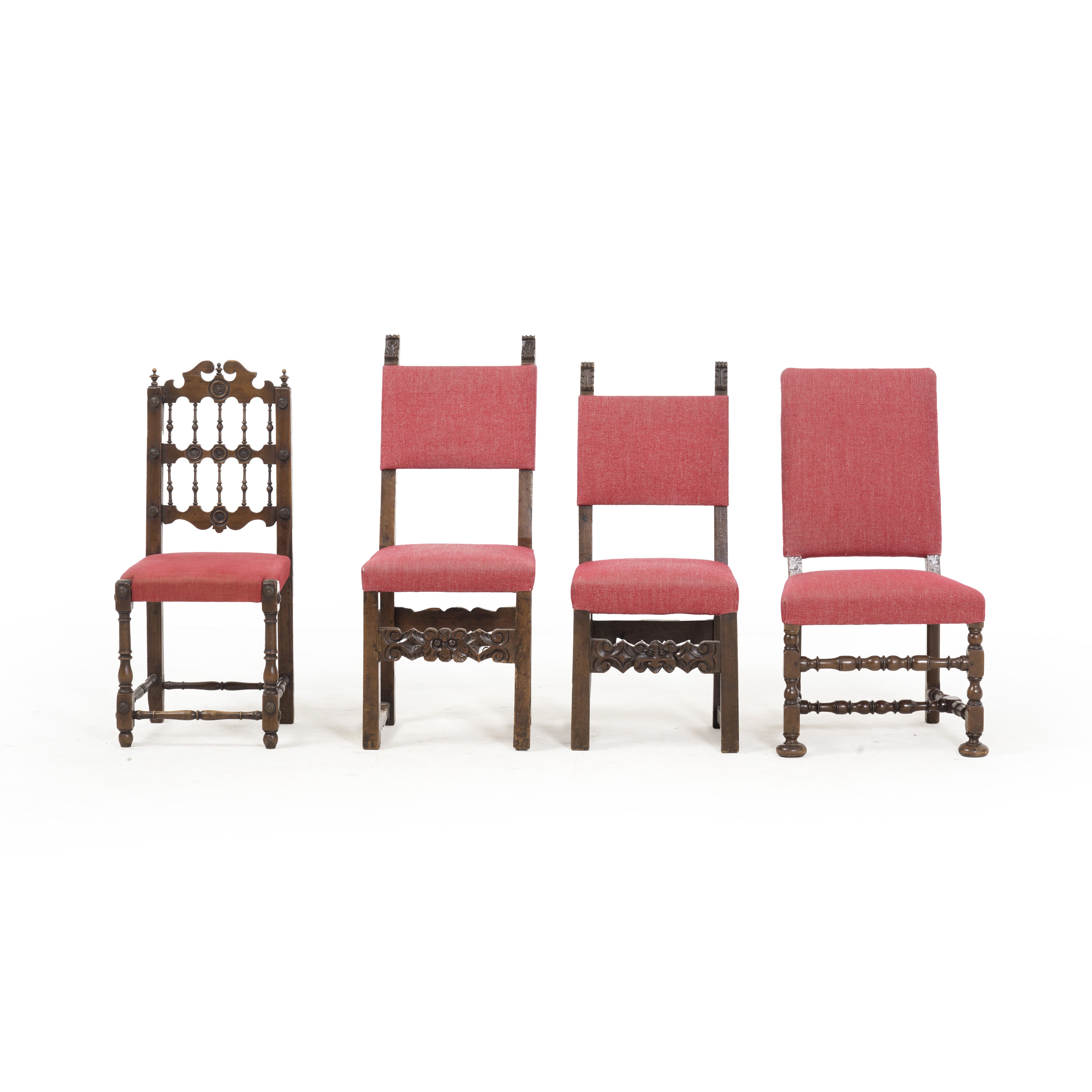 Una con schienale traforato riccamente decorato a colonnine e cimasa a volute, due con terminali e foglia e traverse intagliate, una con gambe a rocchetto