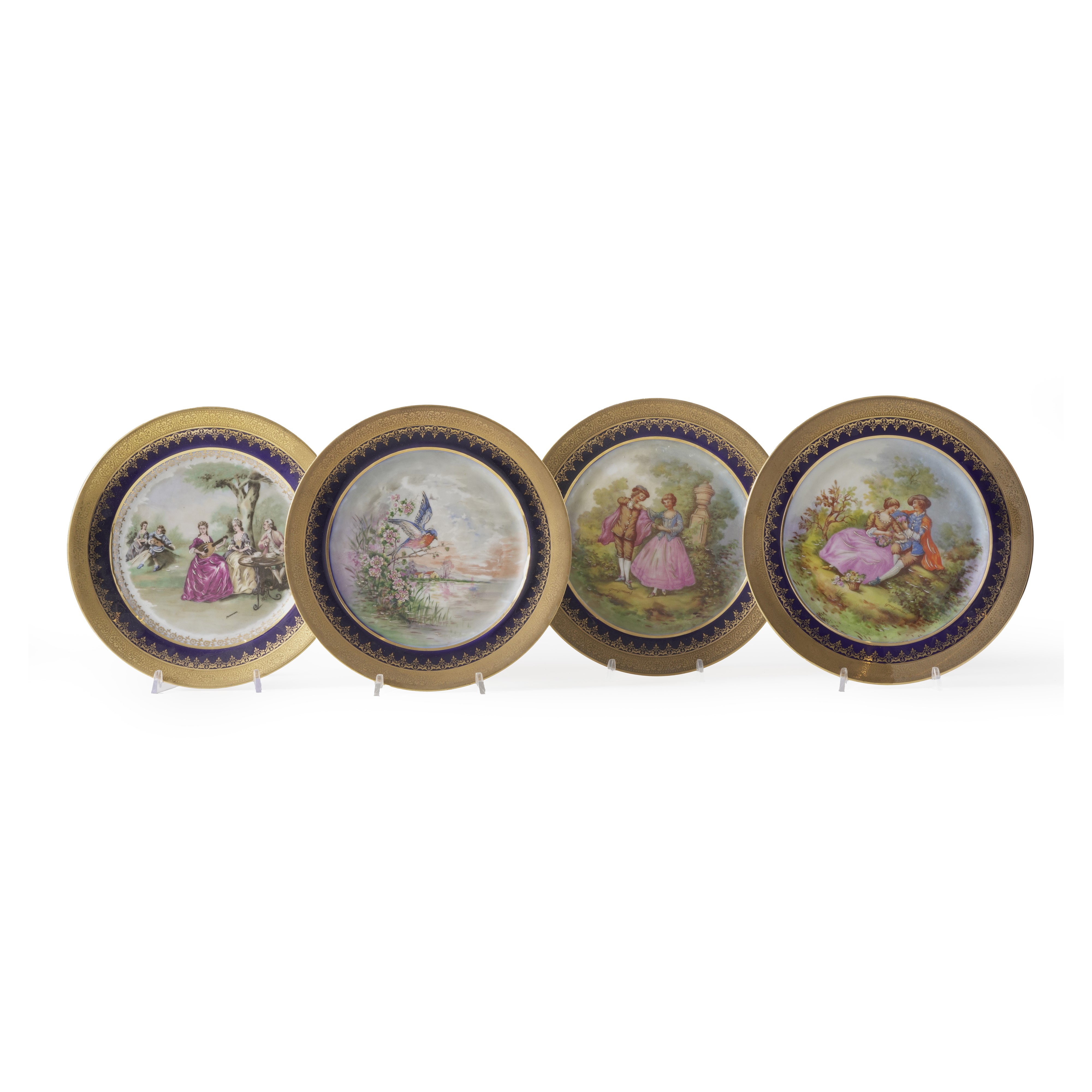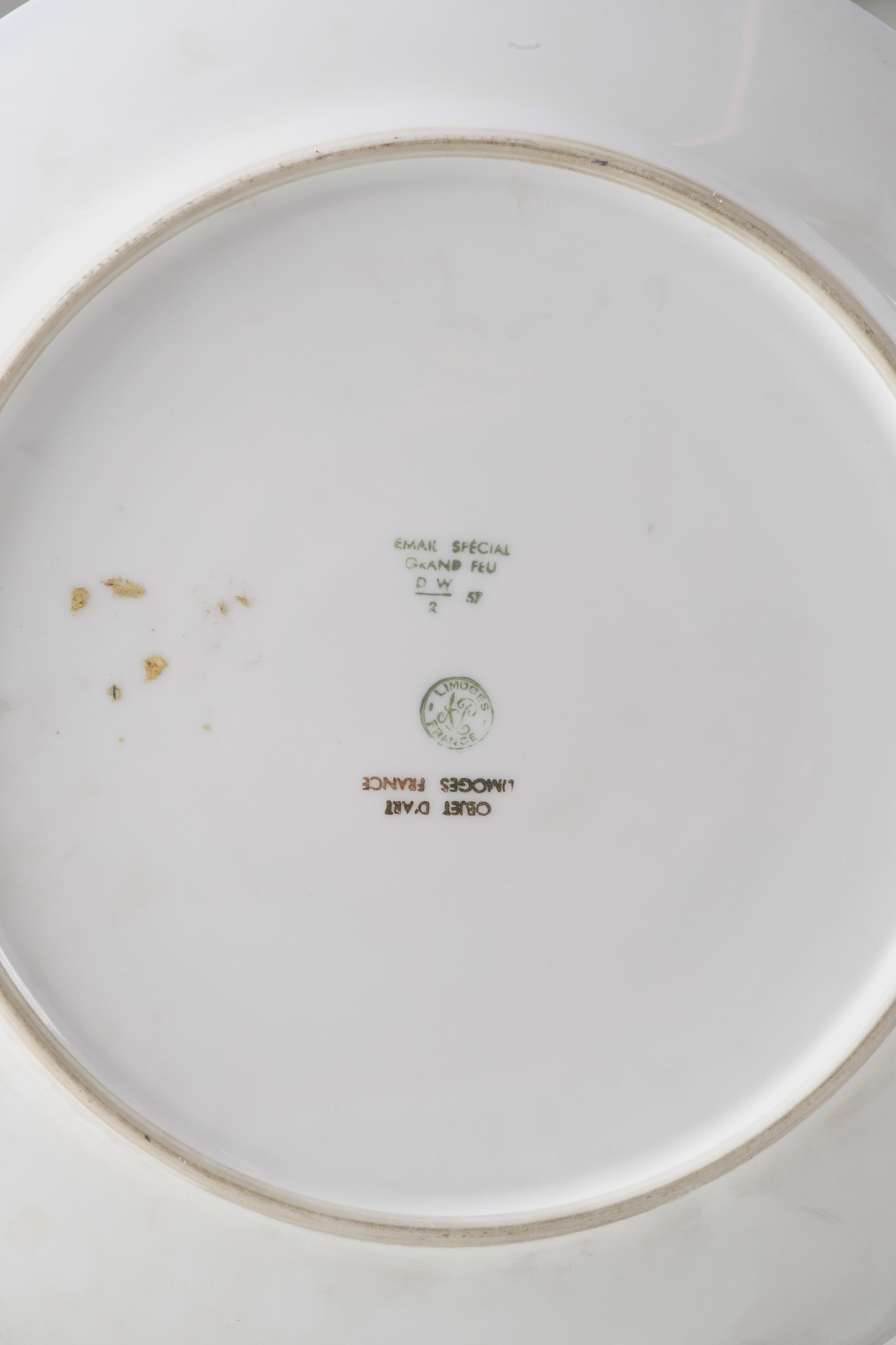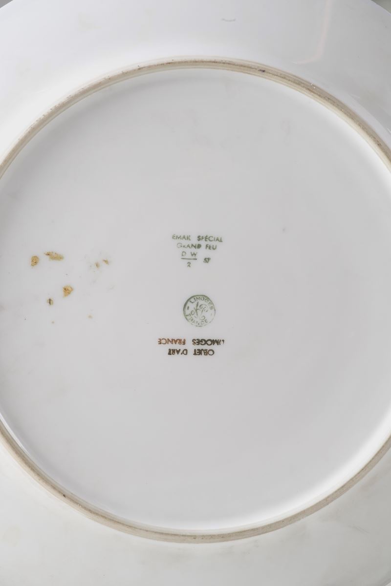 Decoro con scene romantiche in stile settecentesco e paesaggio, bordo blu e dorato, marchio Limoges sotto la mase