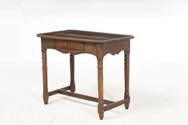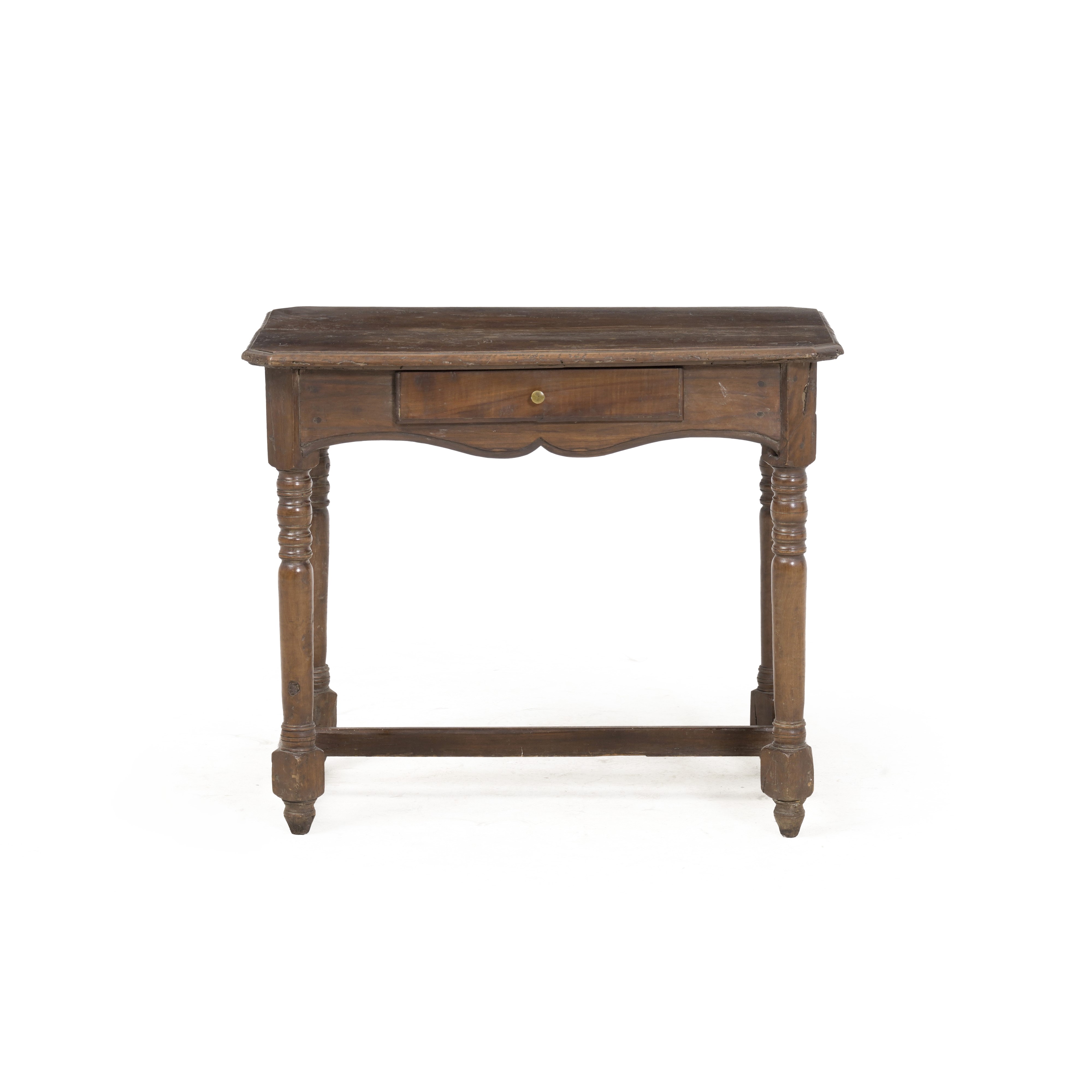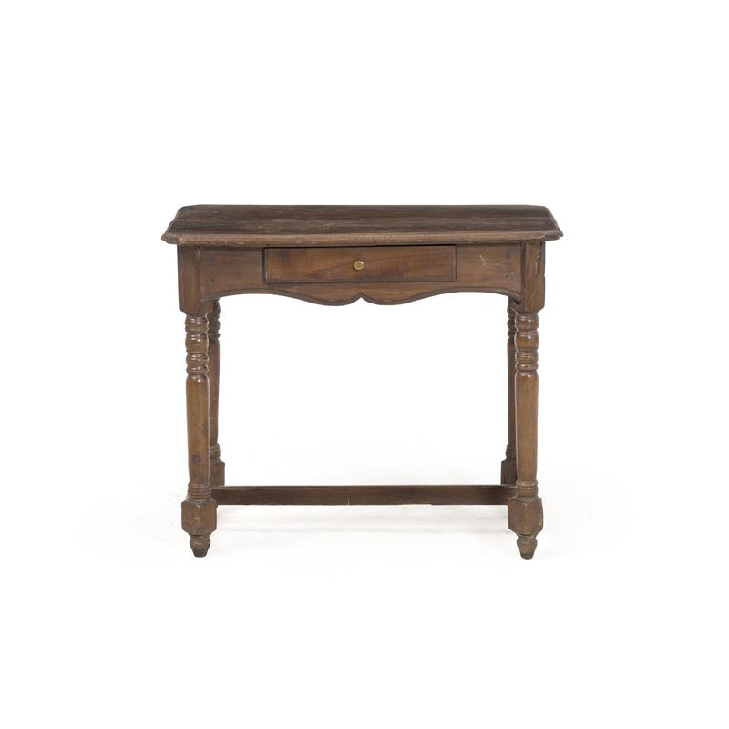 Gambe parzialmente tornite riunite da traversa, un cassetto nella fascia, grambiale sagomato