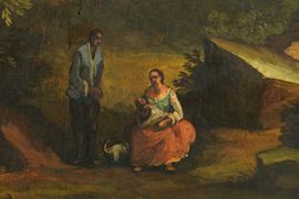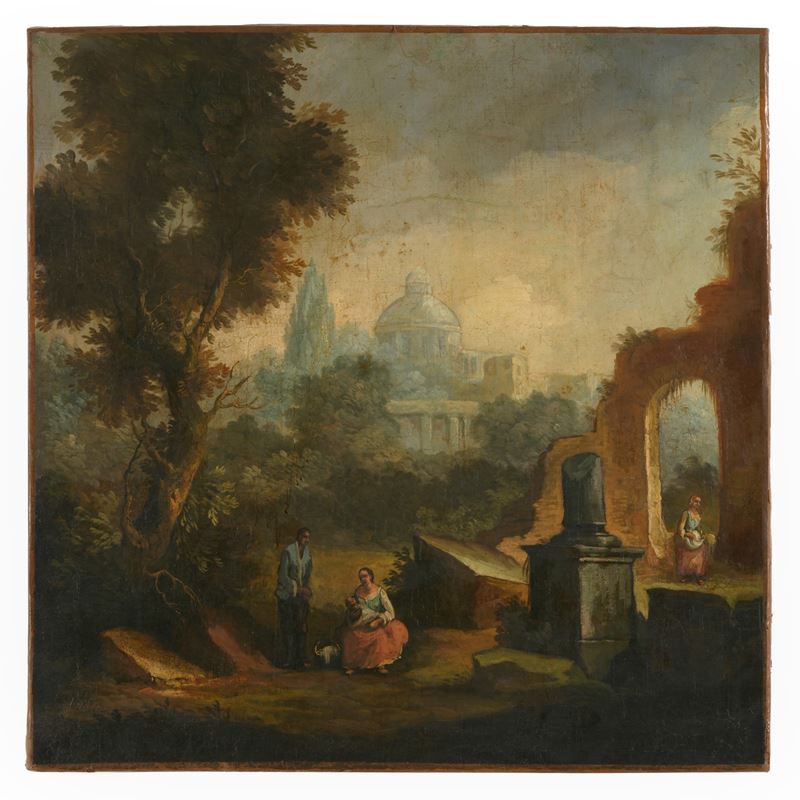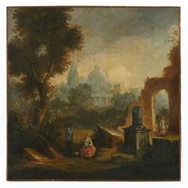 Scuola del XVIII secolo Paesaggio con figure e rovine