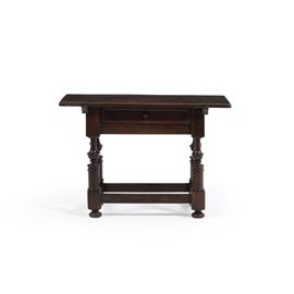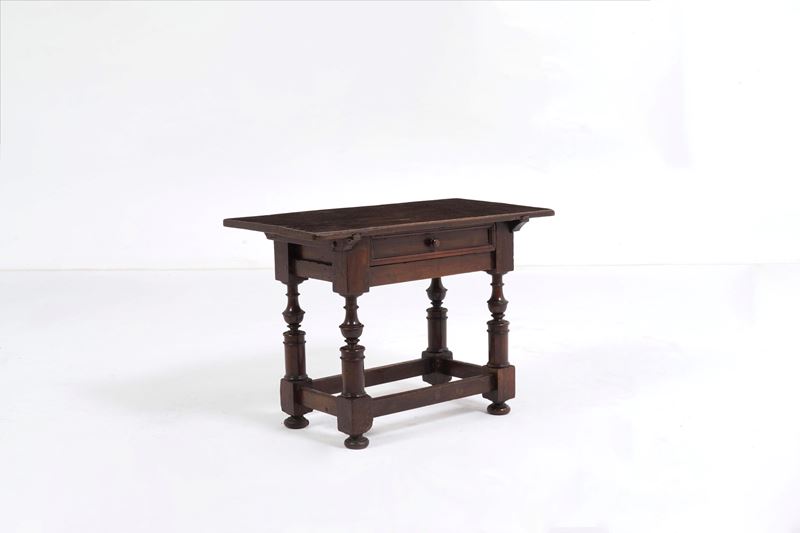 Gambe tornite riunite da traverse, un cassetto nella fascia