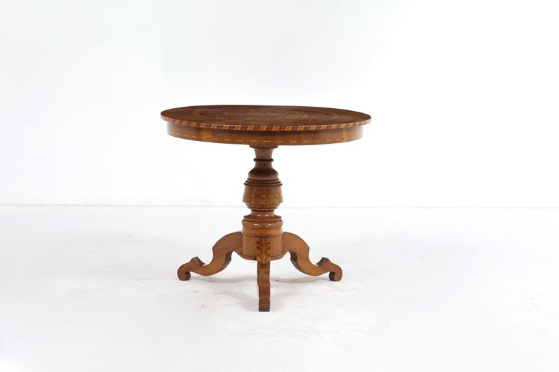 Tavolino tondo con fusto tornito, piedi mossi e decoro geometrico. Sedie imbottite con gambe anteriori tornite e schienale a cartella