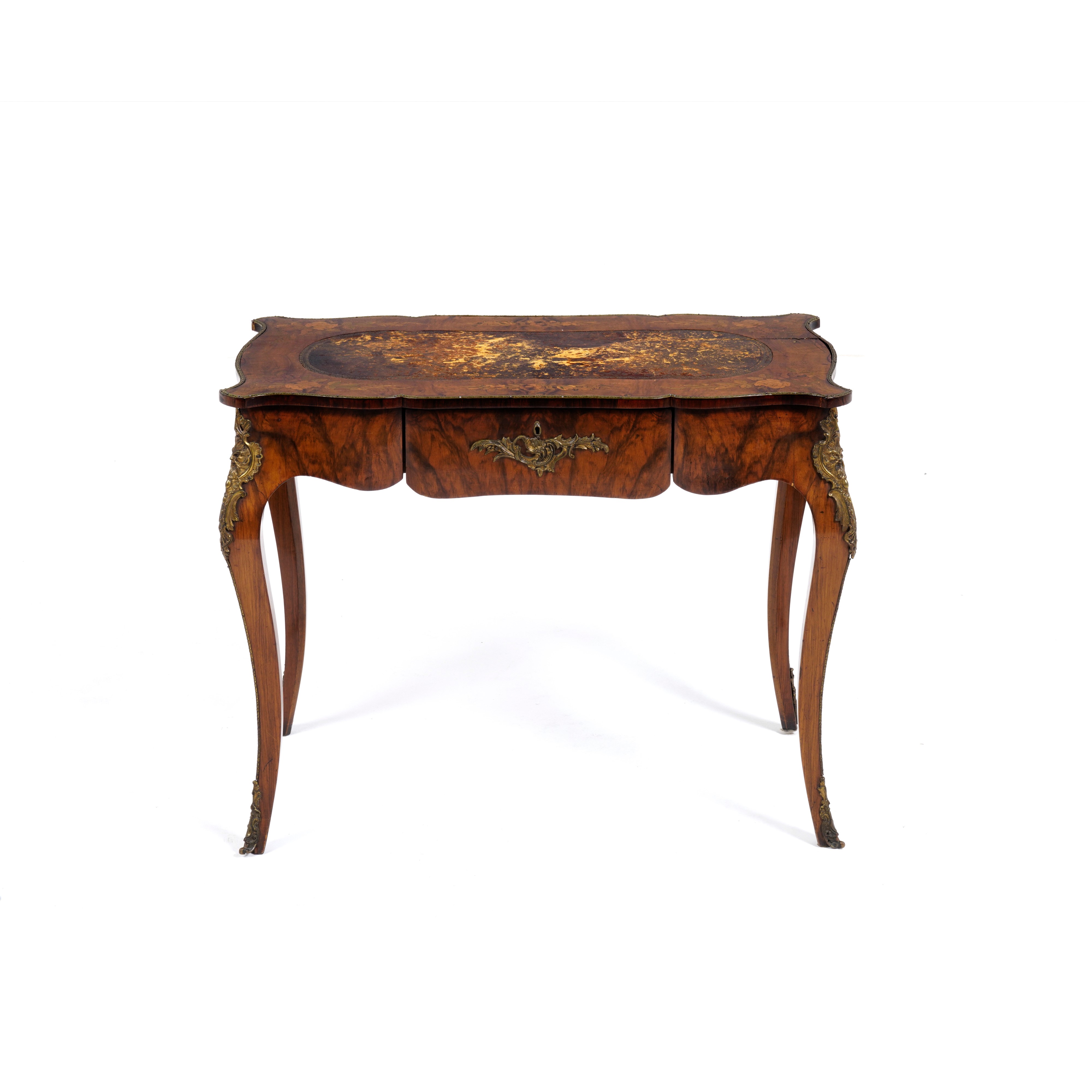 Piano sagomato parzialmente foderato in cuoio e con decori intarsiati, un cassetto nella fascia, gambe mosse, applicazioni decorative in bronzo dorato