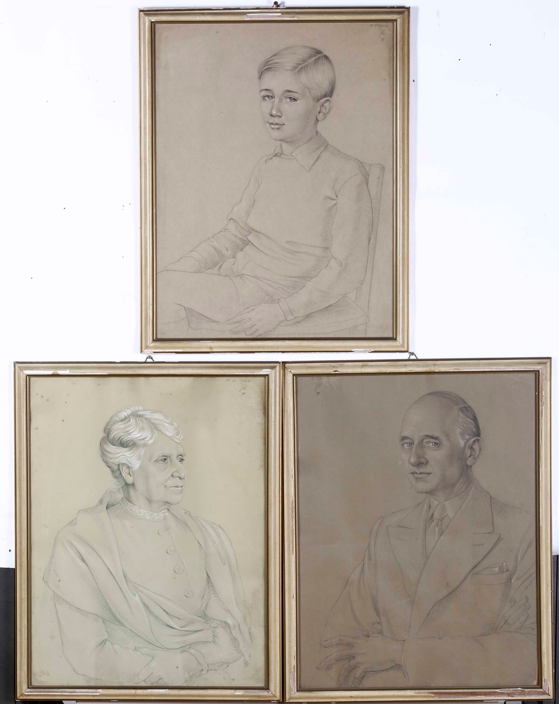 Tre disegni siglati FR 1944 raffiguranti ritratto di fanciullo, signora anziana e gentiluomo