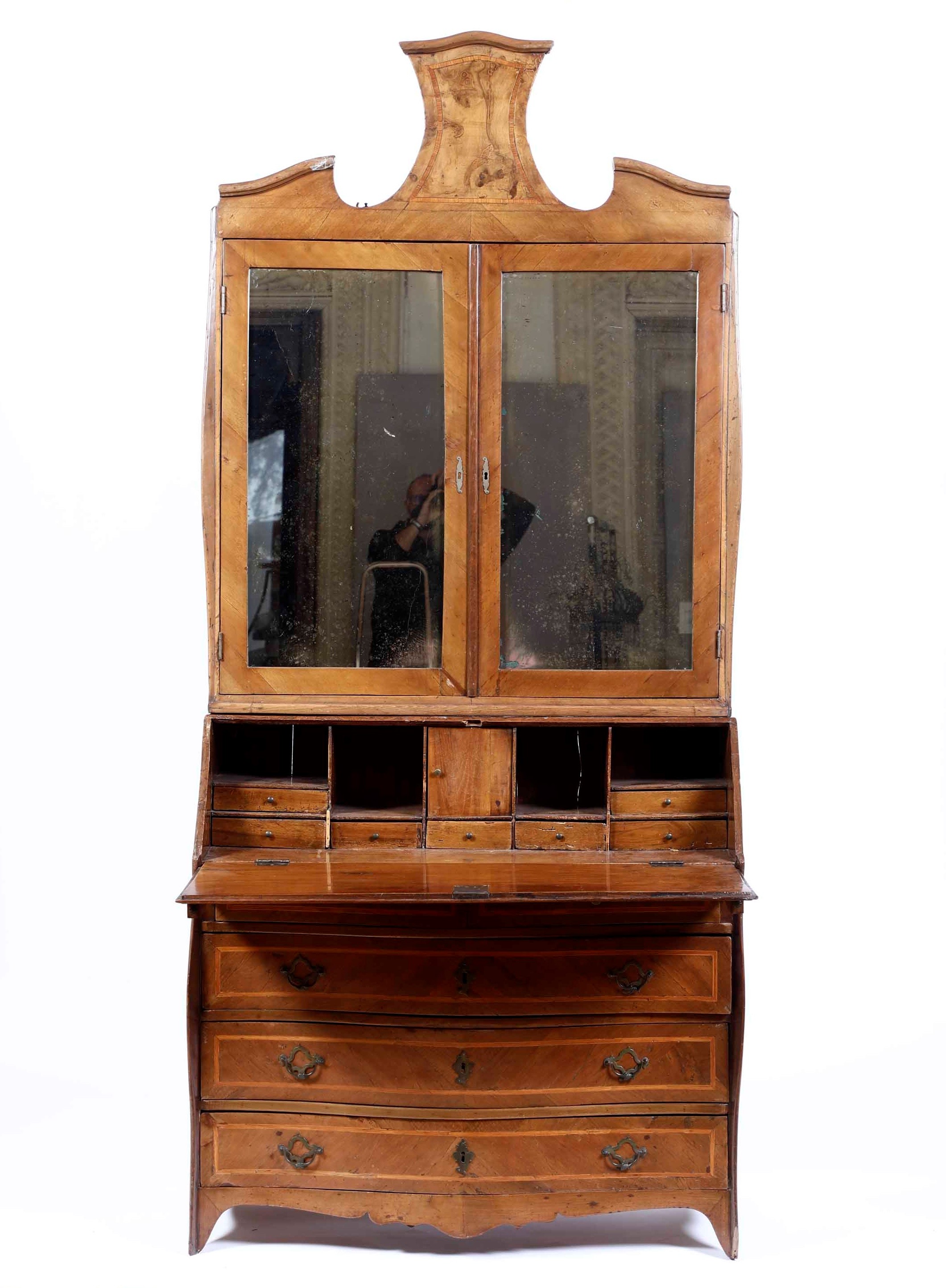 fronte mosso a tre cassetti grandi e due cassetti piccoli, alzata a due ante a specchio, cimasa a timpano spezzato