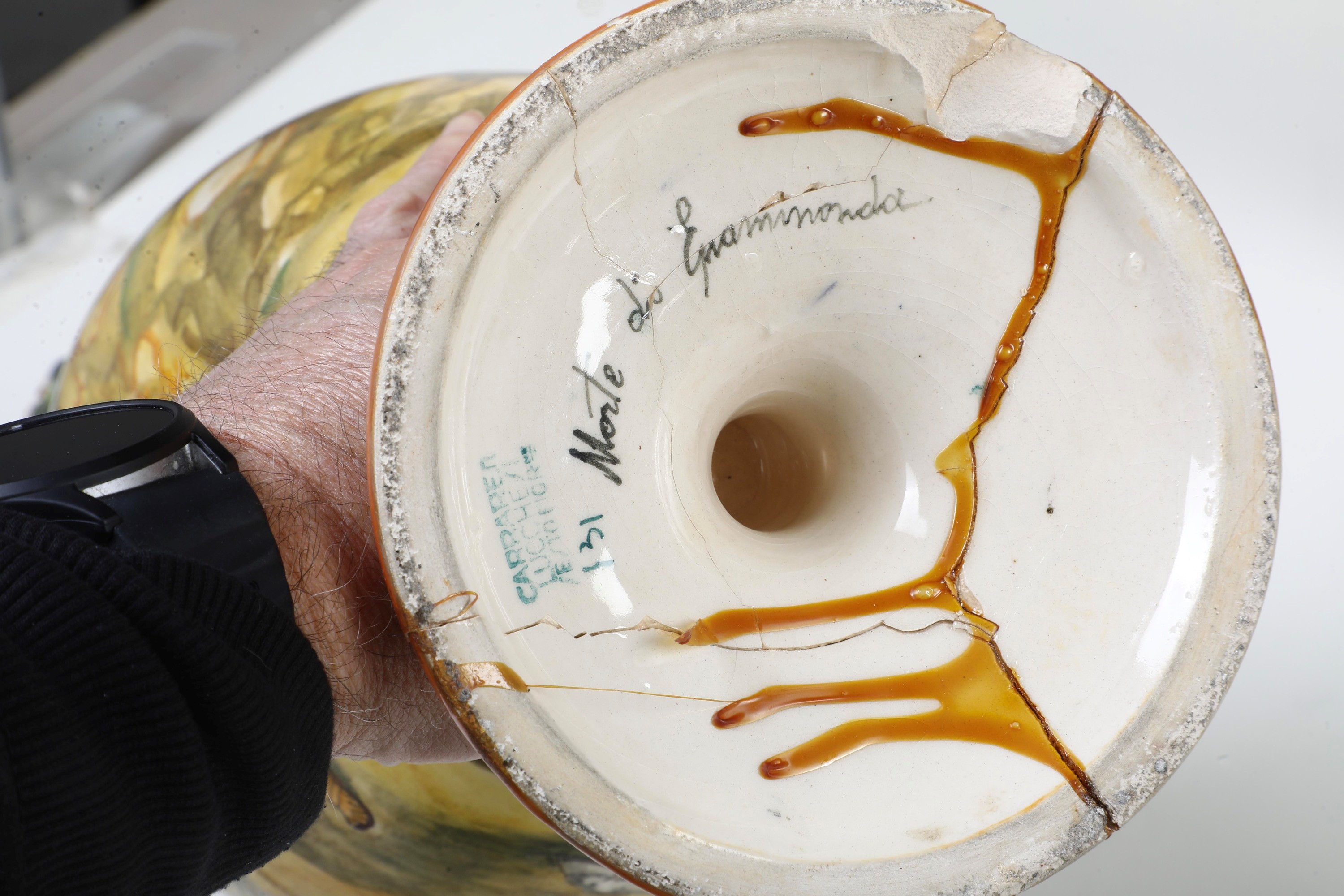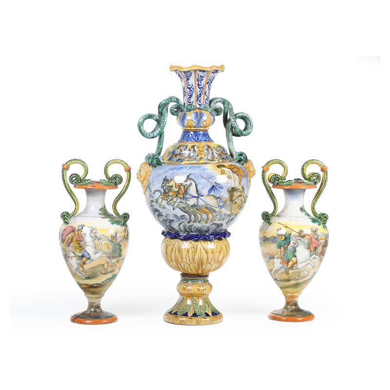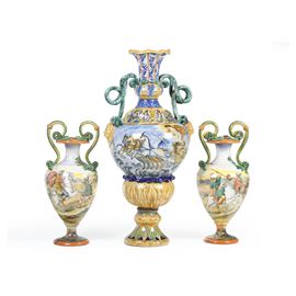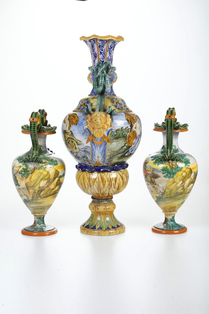 Una coppia di vasi biansati e uno più grande in ceramica invetriata. XX secolo