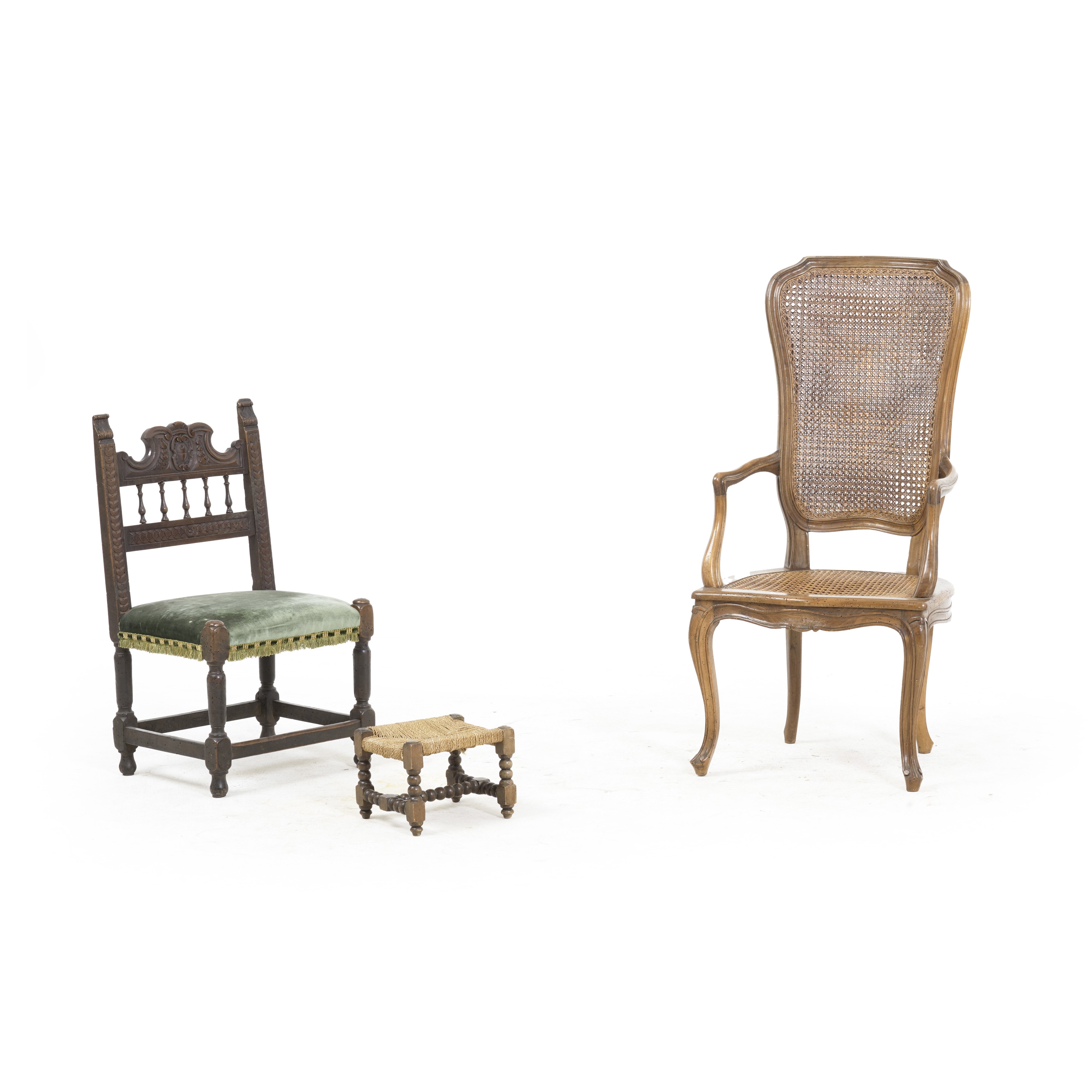 Seggiolina con seduta imbottita, schienale traforato a colonnine, gambe tornite, poltrona in stile settecentesco con seduta e schienale in canneté, poggiapiedi con gambe tornite e piano impagliato