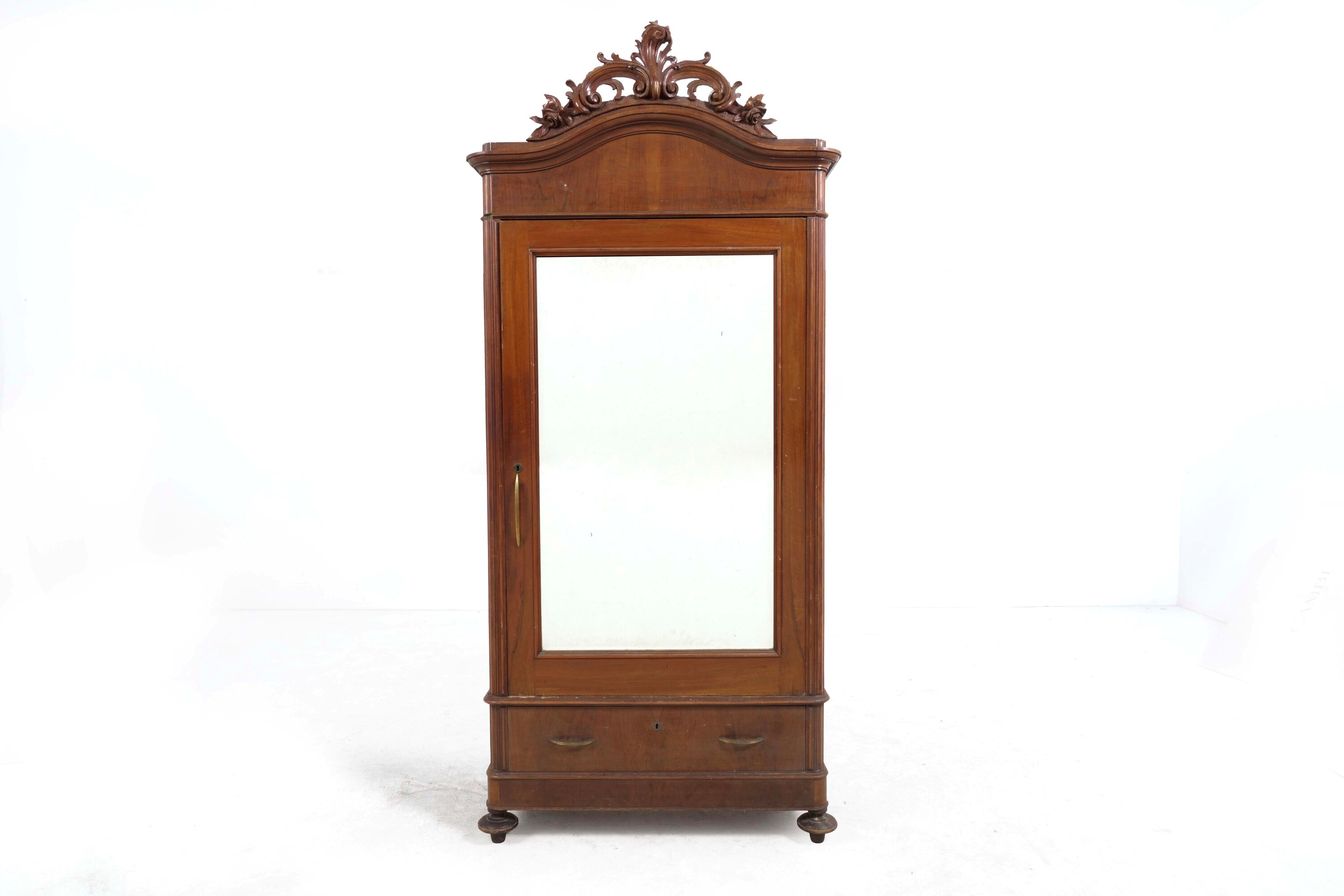 Un'anta a specchio e cassetto alla base, cappello sagomato con cimasa intagliata a motivi fitomorfi