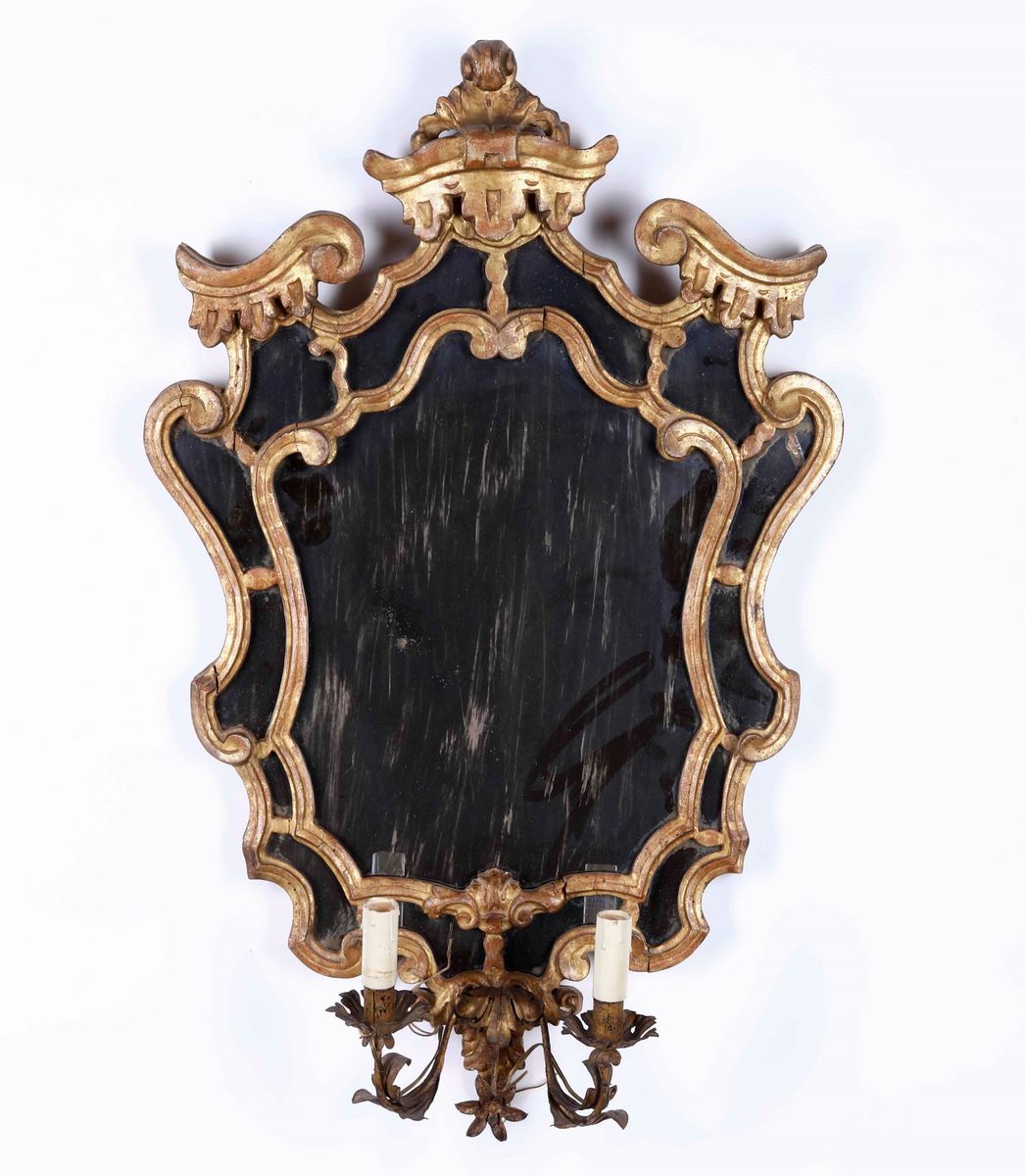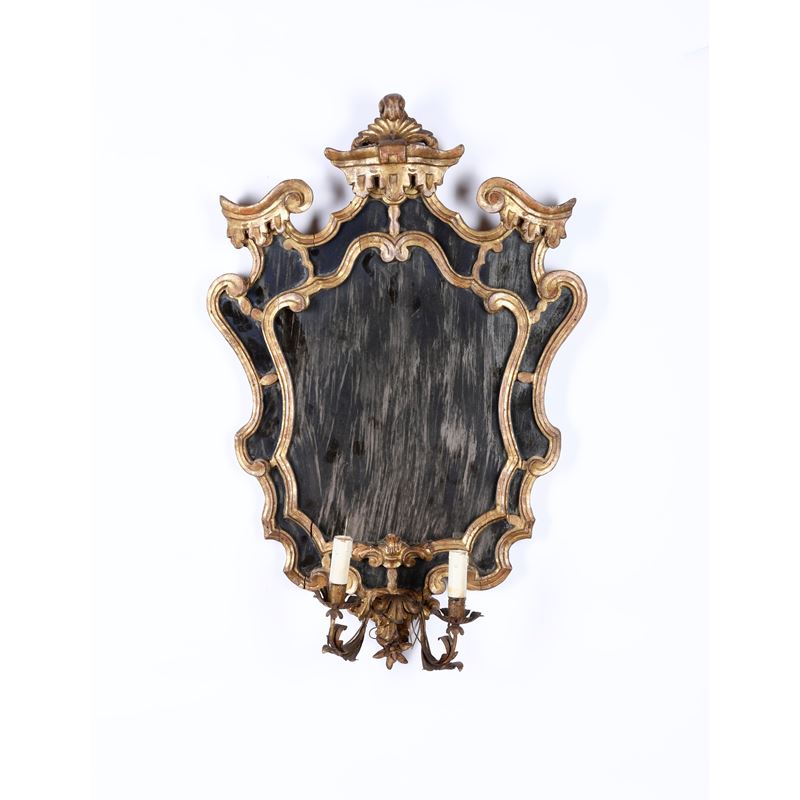 Coppia di specchiere a due luci in legno intagliato e dorato. XVIII-XIX secolo