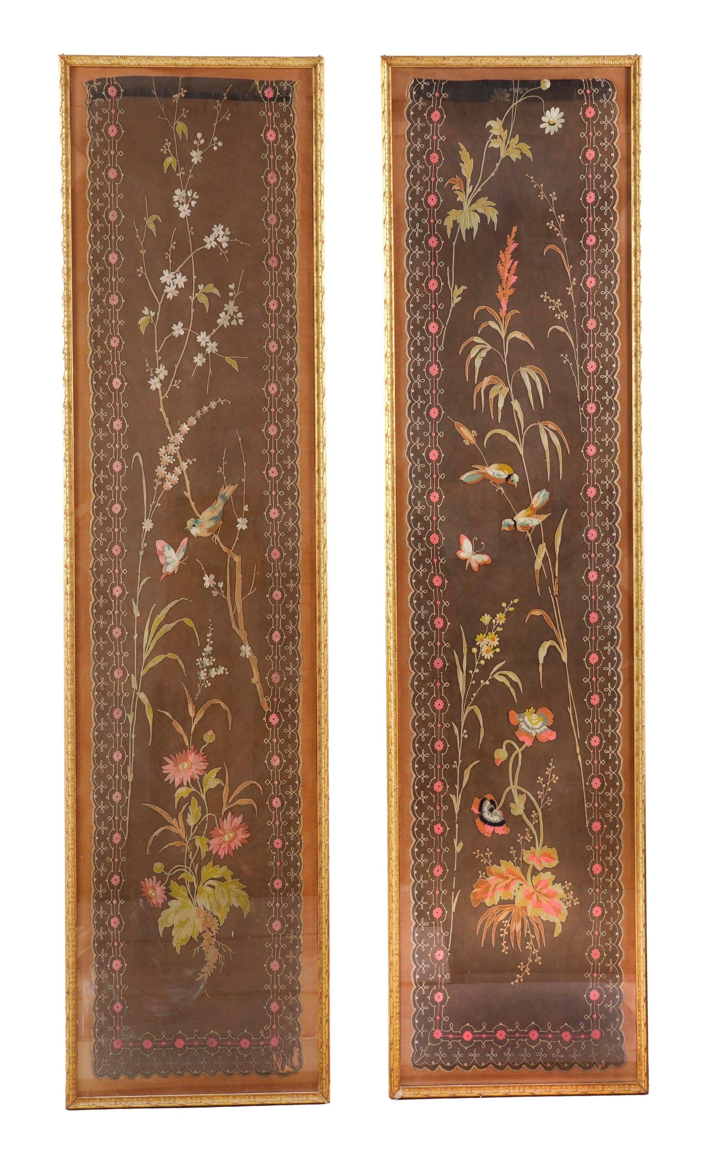 Decoro floreale con uccellini entro bordura riccamente decorata. Montati su pannelli entro cornici, sotto vetro