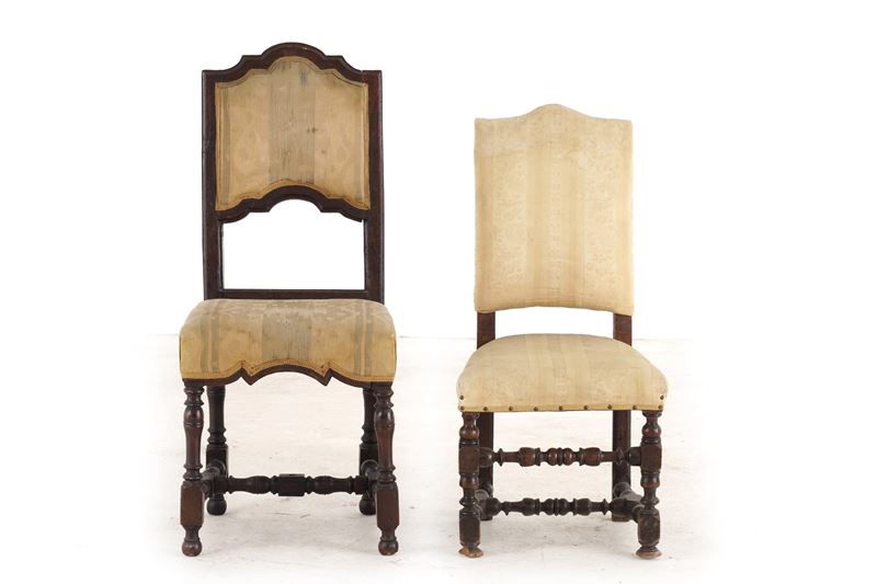 Due di gusto settecentesco con gambe mosse e schienale a cartella, due di gusto secentesco con gambe a rocchetto e una Luigi Filippo