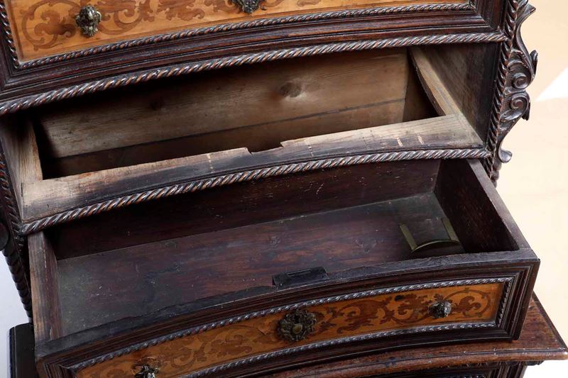 Fronte a quattro cassetti lastronati e intarsiati a racemi, cornicette modanate, fasce intagliate a unghiature