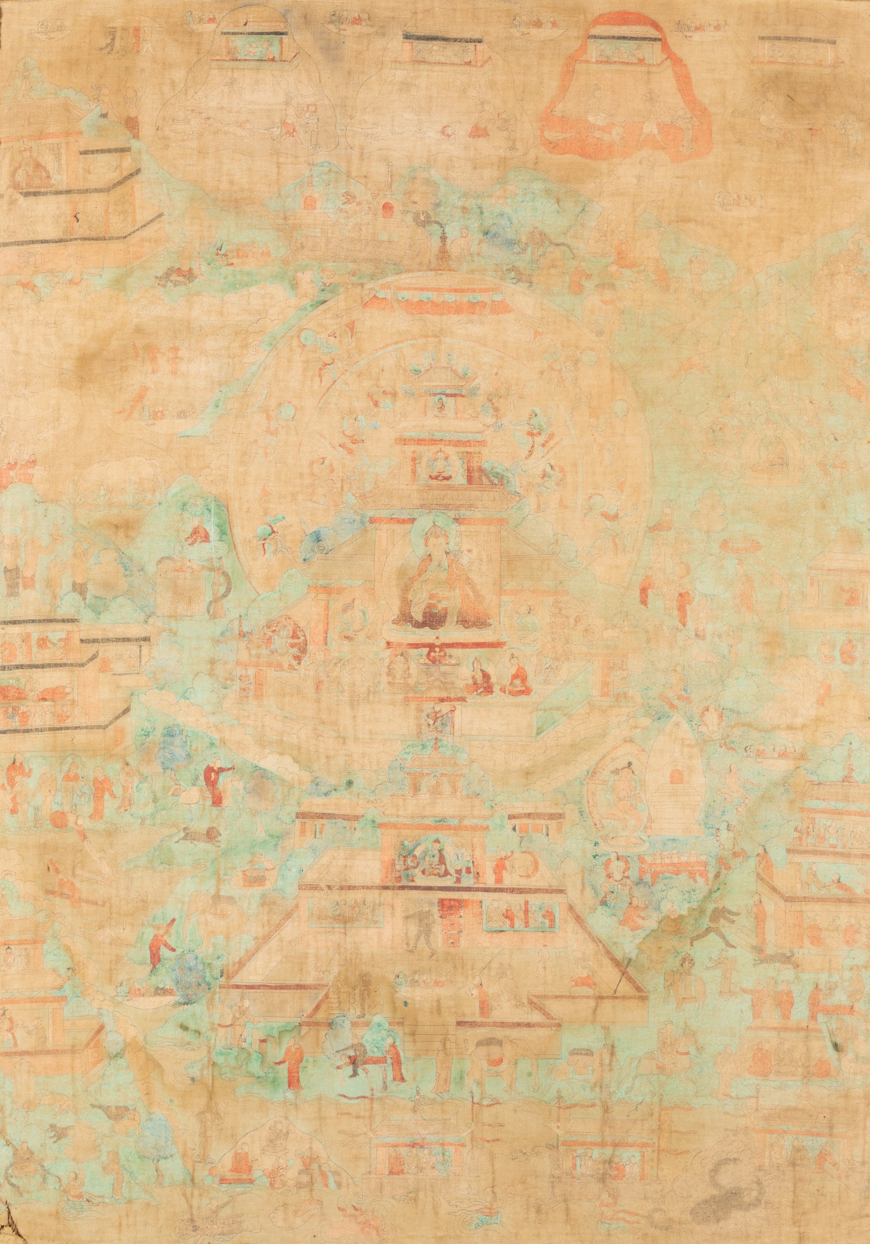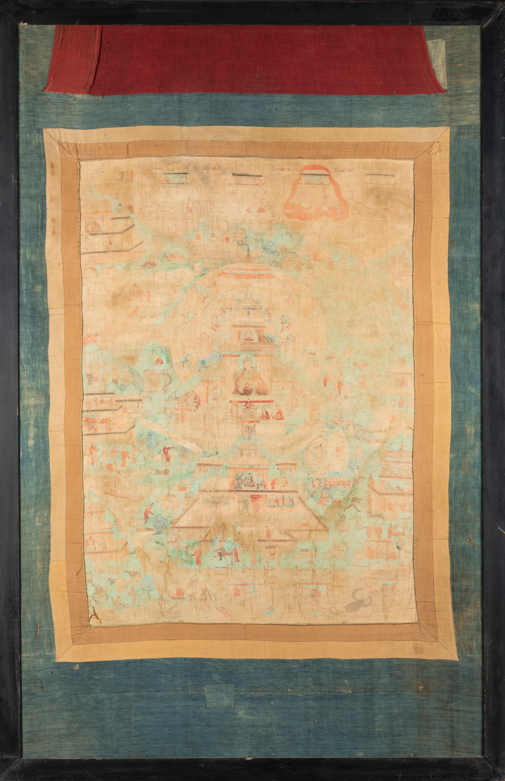 Thangka su seta raffigurante tempio con figura di Lama centrale, Tibet, XIX secolo
