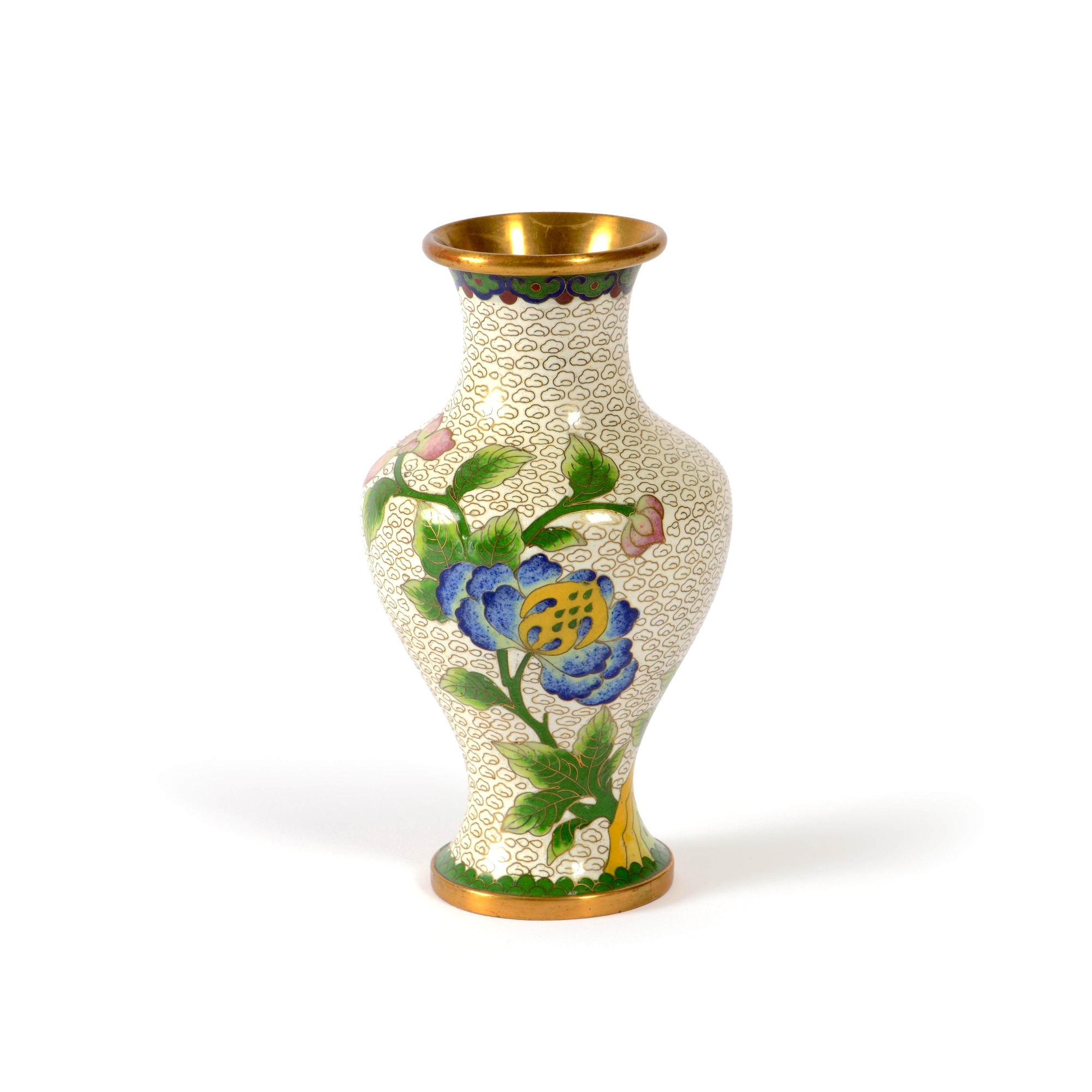 Vaso a smalti cloisonné con decori floreali su fondo bianco, Cina, XX secolo