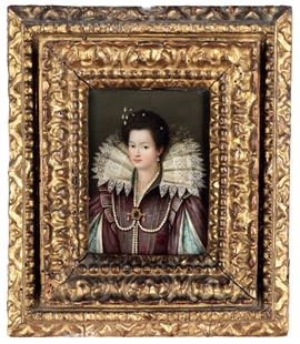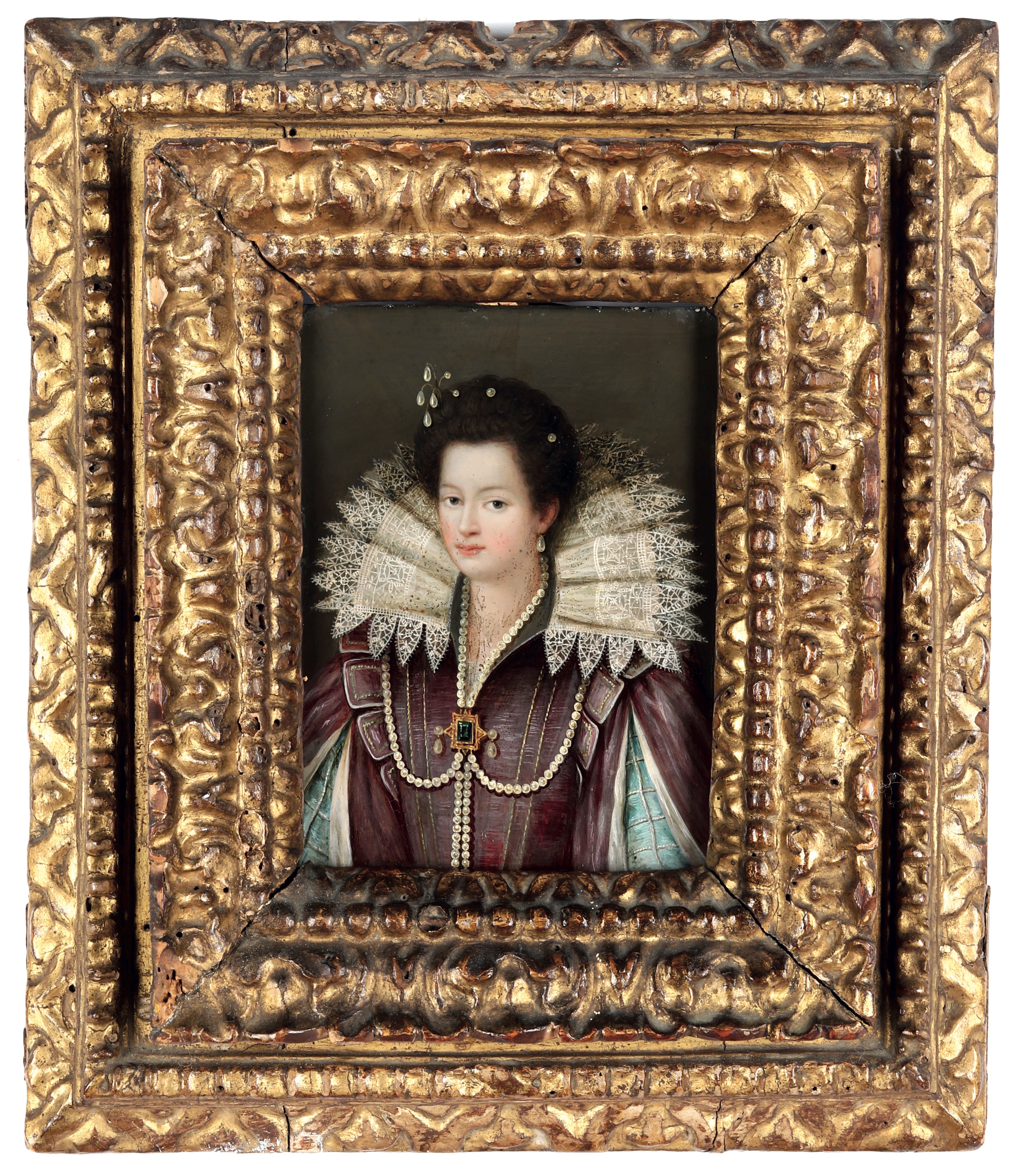 Scuola del XVII secolo Ritratto di gentildonna con colletto in pizzo e monili di perle