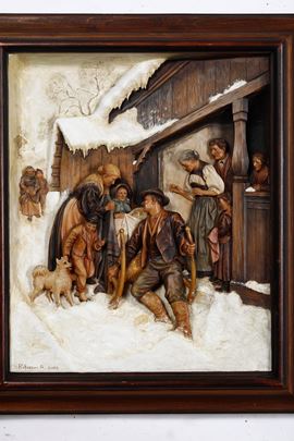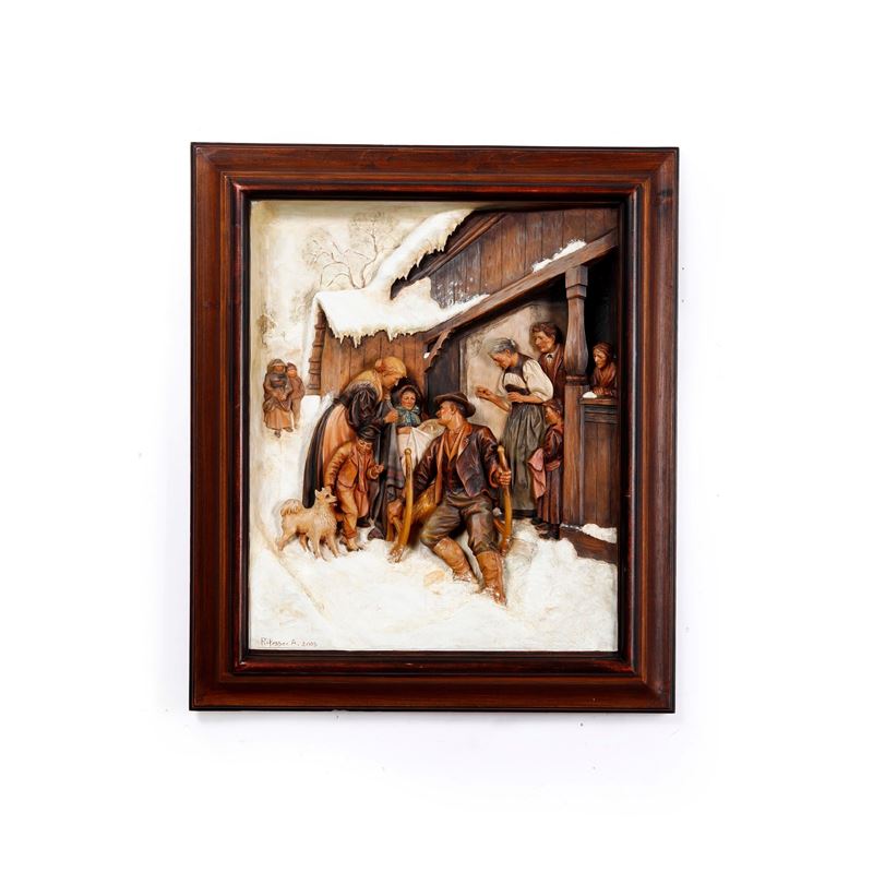 Bassorilievo in legno con scena di montagna, manifattura altoatesina
