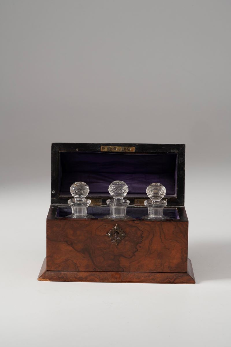 Cofanetto da viaggio per liquori impiallacciato in radica