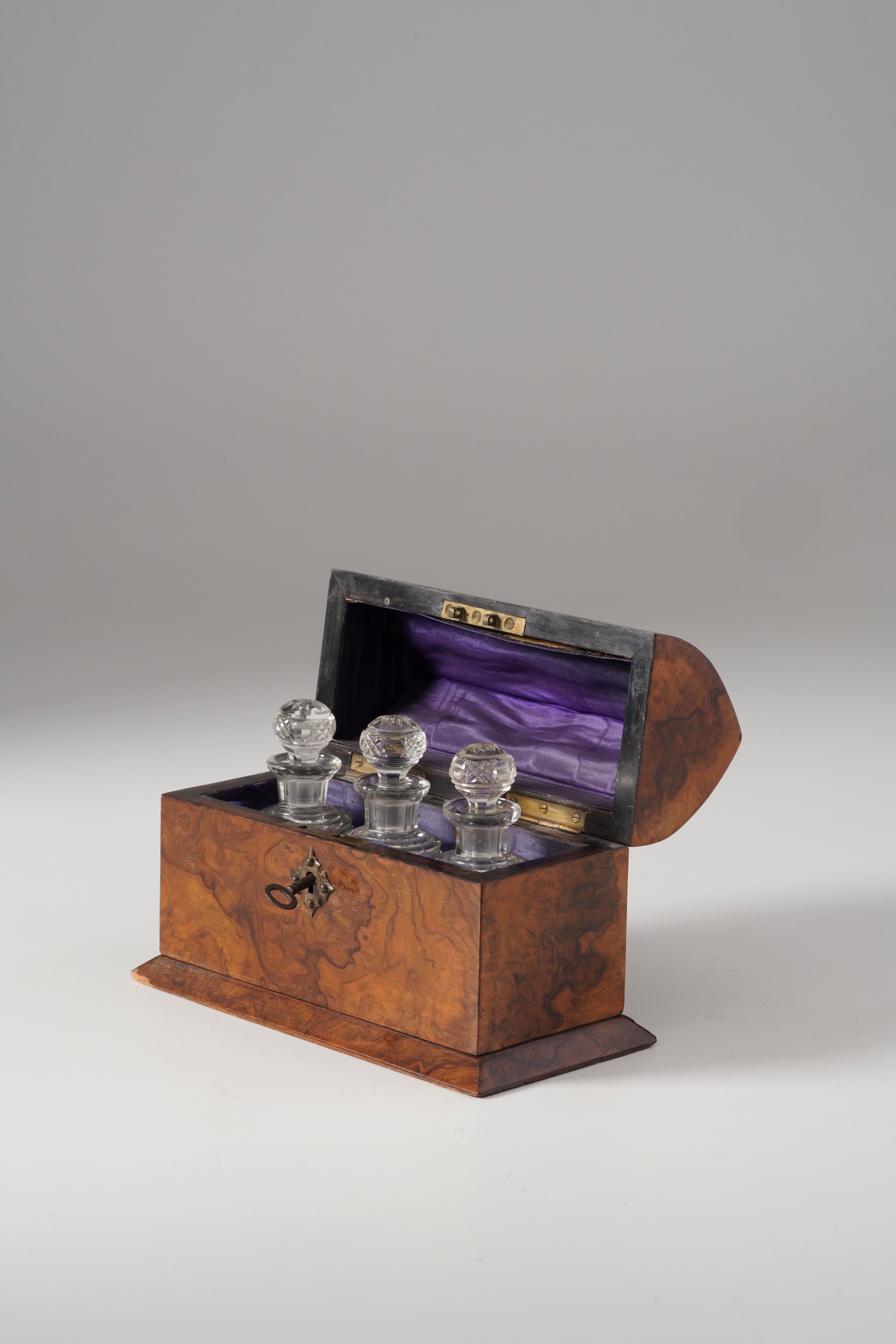 Coperchio incernierato e bombato, contenente tre piccole bottiglie di vetro molato con tappi