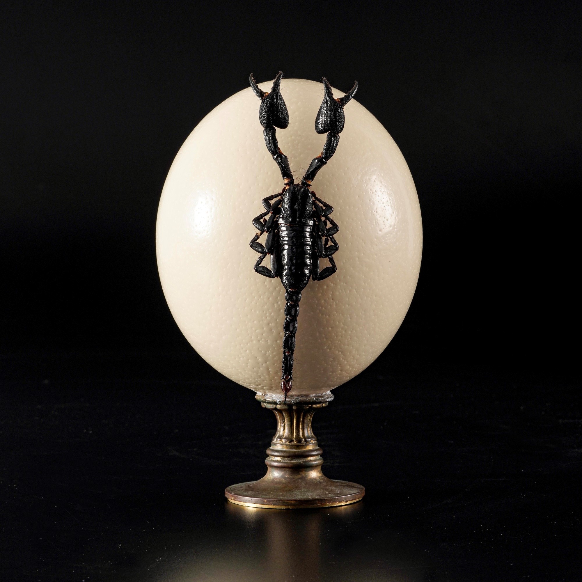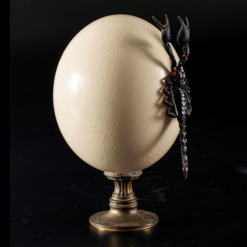 Grande uovo di struzzo su base in metallo dorato e tassidermia di scorpione. (Javanimetrus Cyaneus)