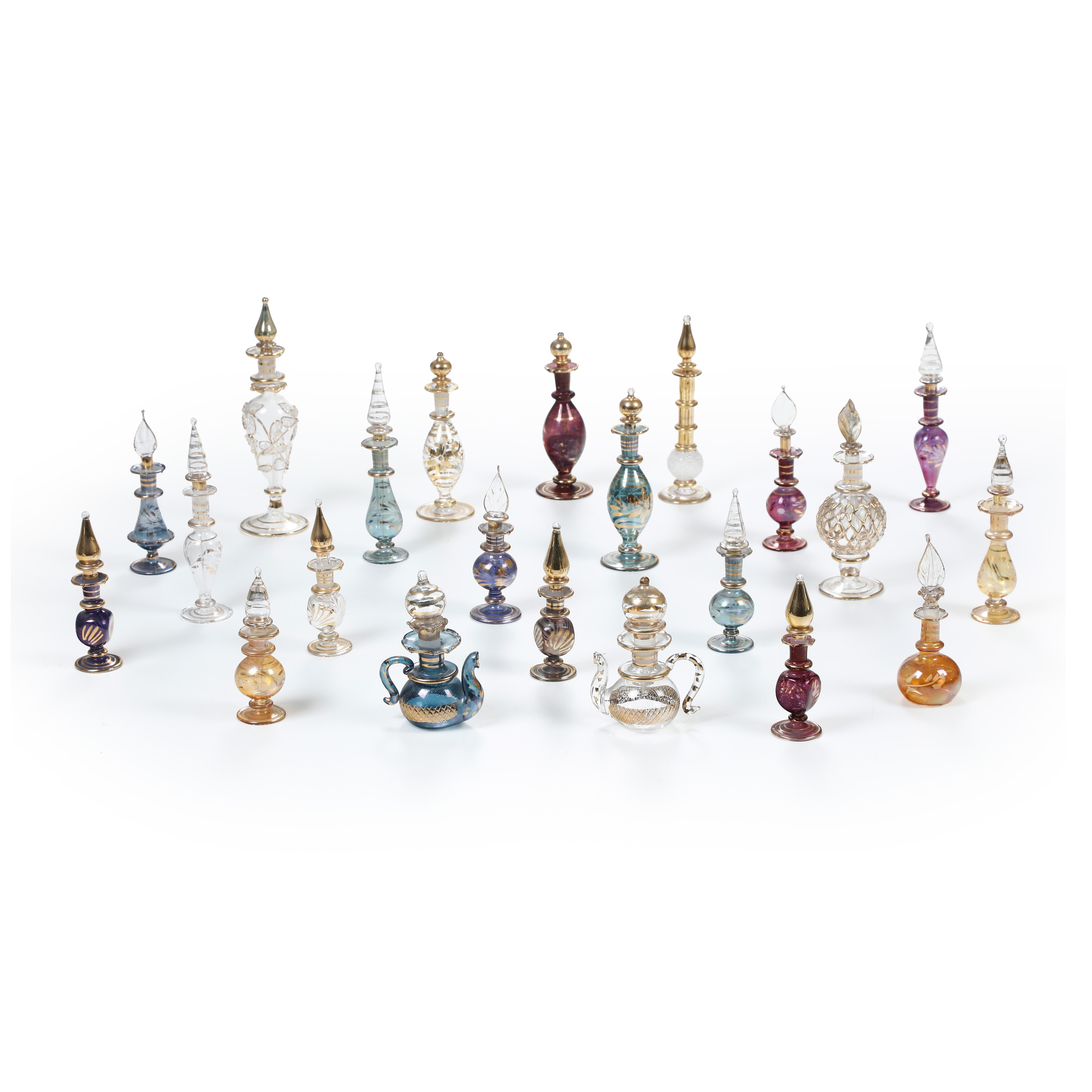 Lotto di 22 bottigliette da profumo in vetro colorato. XX secolo