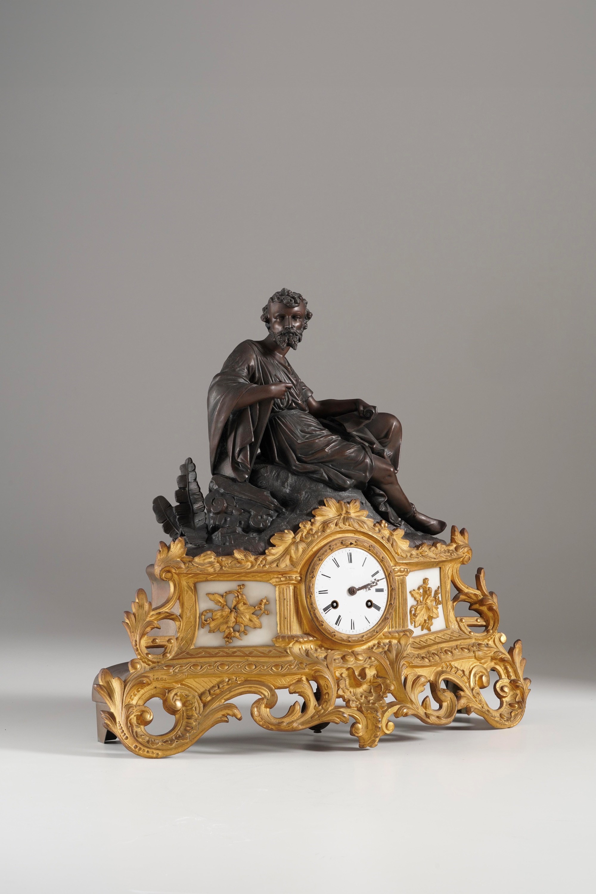 Cassa con decoro rocaille, cimasa con filosofo in bronzo patinato, quadrante in smalto bianco con numeri romani