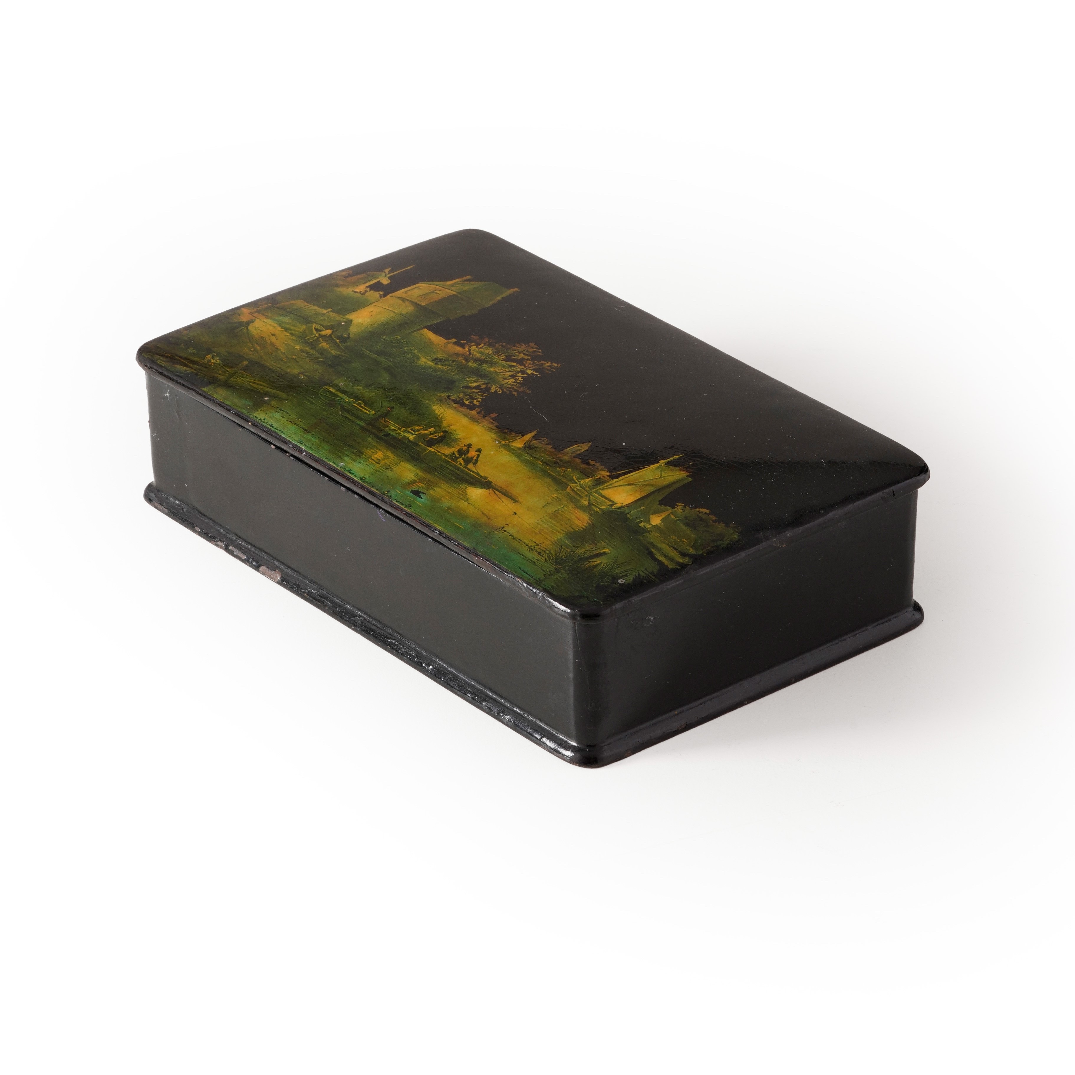 Sul coperchio decoro policromo con paesaggio fluviale con mulini