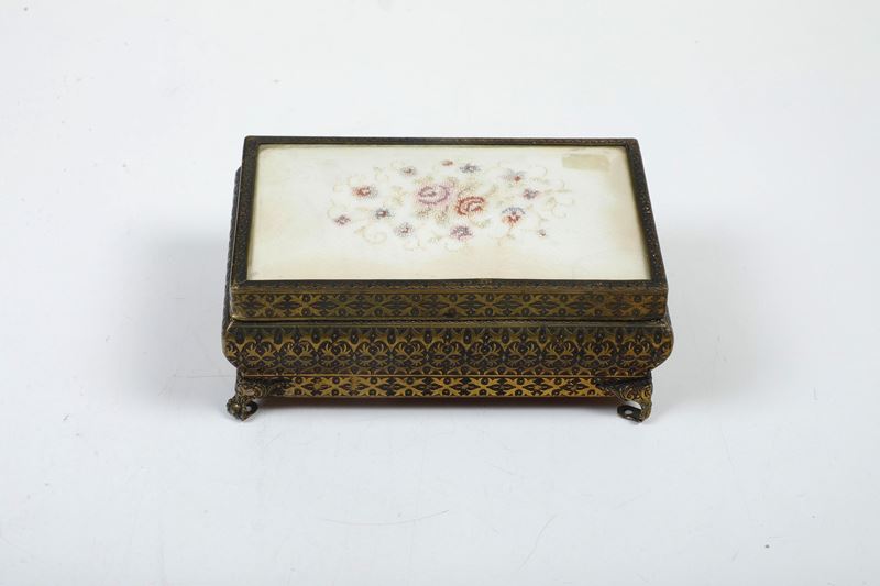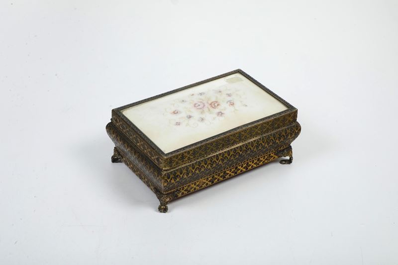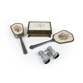 con specchio, spazzola e scatola n metallo. Si aggiunge binocolo da teatro parzialmente lastronato in madreperla